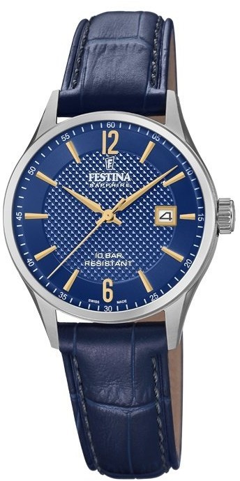 Festina Swiss Made 20009/3 sú dámske elegantné batériové hodinky na modrom koženom remienku s tŕňovou sponou. Puzdro z nerezovej ocele má priemer 29 milimetrov. Modrý číselník so stredom zdobeným gilošou a ukazovateľom dátumu na tretej hodine je chránený odolným zafírovým sklíčkom. Chod hodiniek zaisťuje quartzový strojček Ronda 775-3H201BL. S vodotesnosťou 10 ATM sú hodinky vhodné na plávanie či šnorchlovanie.
