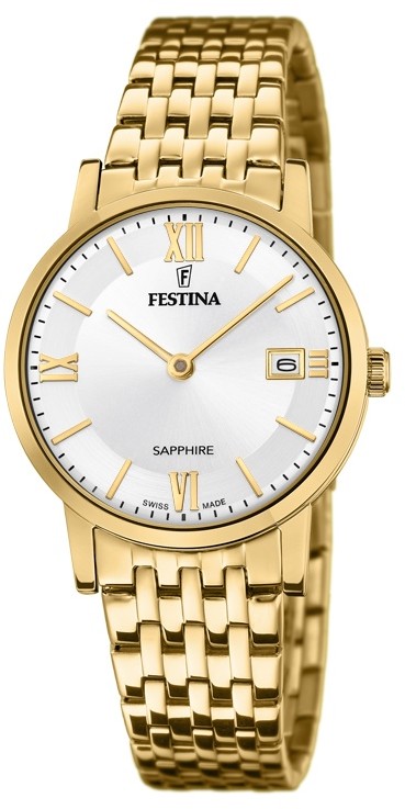 Festina Swiss Made 20021/1 sú dámske batériové hodinky v klasickom štýle na oceľovom náramku s povrchovou PVD úpravou zlatej farby a preklápacou sponou. Puzdro z nerezovej ocele v rovnakej farbe má priemer 29,3 milimetra. Priehľadný strieborný číselník s efektom slnečného brusu a ukazovateľom dátumu na tretej hodine je chránený odolným zafírovým sklíčkom. Chod hodiniek zaisťuje quartzový strojček Ronda 784-3H101BL. S vodotesnosťou 5 ATM sú hodinky odolné proti dažďu a pri sprchovaní.