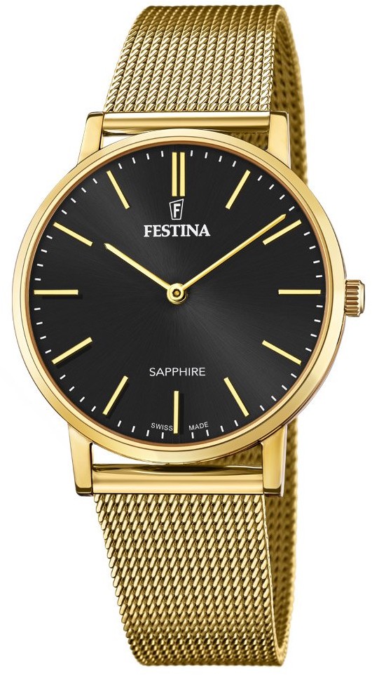 Festina Swiss Made 20022/3 sú pánske elegantné batériové hodinky na oceľovom milánskom ťahu s povrchovou PVD úpravou zlatej farby a posuvnou sponou. Puzdro z nerezovej ocele v rovnakej farbe má priemer 39,3 milimetra. Priehľadný čierny číselník s efektom slnečného brusu je chránený odolným zafírovým sklíčkom. Chod hodiniek zaisťuje quartzový strojček Ronda 762-H1. S vodotesnosťou 5 ATM sú hodinky odolné proti dažďu a pri sprchovaní.