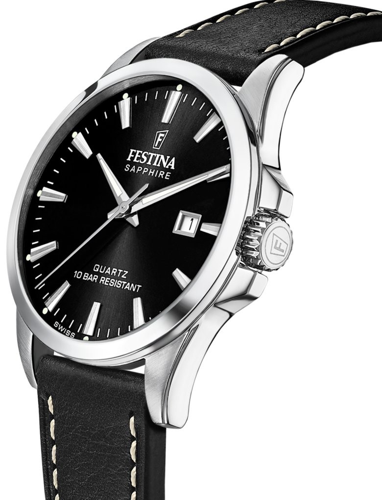 Festina Swiss Made 20025/4 sú pánske elegantné batériové hodinky na čiernom koženom remienku s kontrastným prešívaním a tŕňovou sponou. Puzdro z nerezovej ocele má priemer 41 milimetrov. Priehľadný čierny číselník s ukazovateľom dátumu na tretej hodine je chránený odolným zafírovým sklíčkom. Ručičky a indexové body majú luminiscenčný náter, ktorý po nasvietení uľahčuje čitateľnosť za zhoršených svetelných podmienok. Chod hodiniek zaisťuje quartzový strojček Ronda 705-3h201bl. S vodotesnosťou 10 ATM sú hodinky vhodné na plávanie či šnorchlovanie.