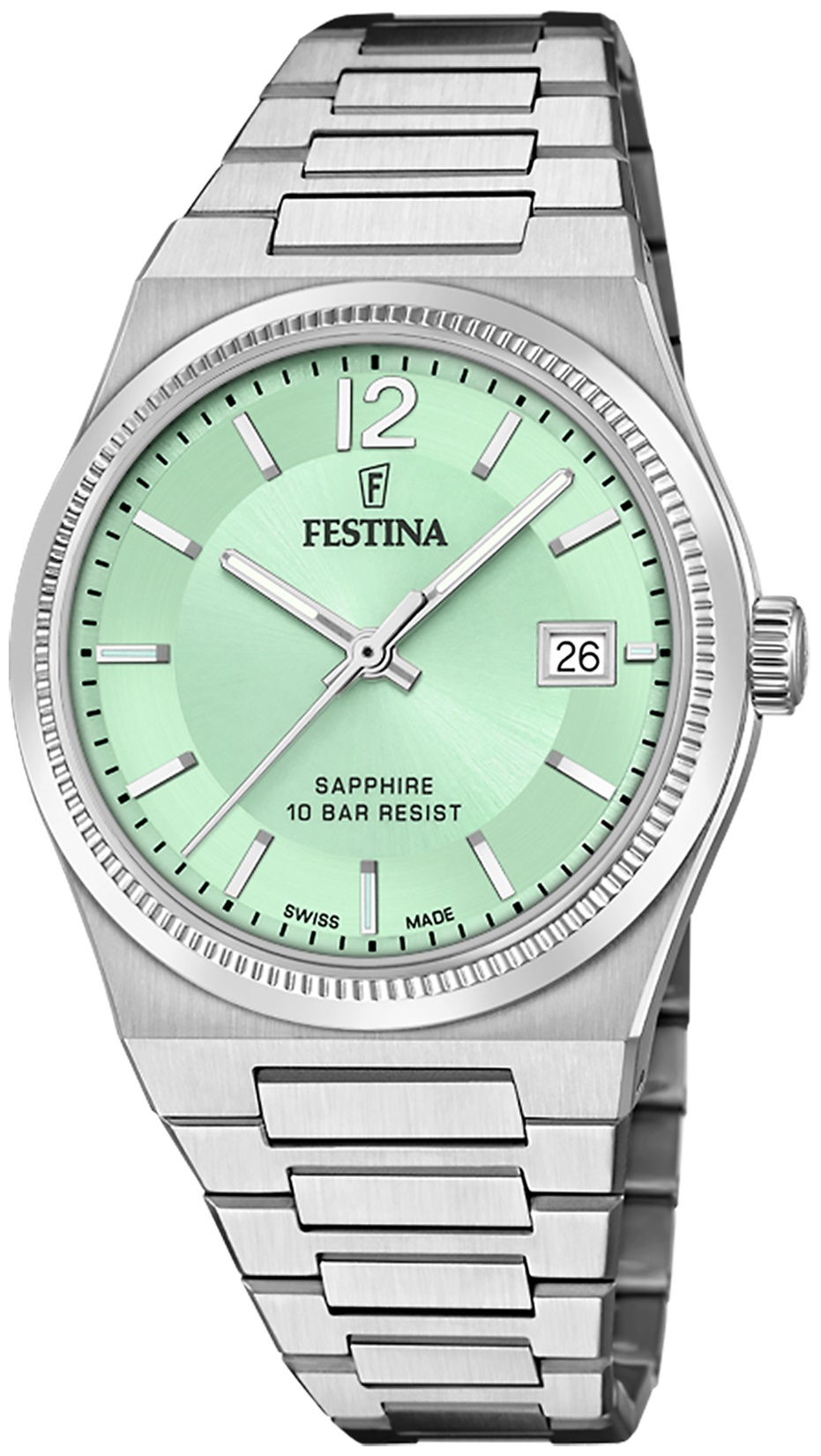 Festina Swiss Made 20035/3 sú dámske batériové hodinky v klasickom štýle na oceľovom náramku s motýlikovou sponou. Puzdro z nerezovej ocele má priemer 35 milimetrov. Priehľadný svetlozelený číselník s efektom slnečného brusu a ukazovateľom dátumu na tretej hodine je chránený odolným zafírovým sklíčkom. Ručičky a niektoré indexy majú luminiscenčný náter, ktorý po nasvietení uľahčuje čitateľnost za zhoršených svetelných podmienok. Chod hodiniek zaisťuje quartzový strojček Ronda 715. S vodotesnosťou 10 ATM sú hodinky vhodné na plávanie či šnorchlovanie.