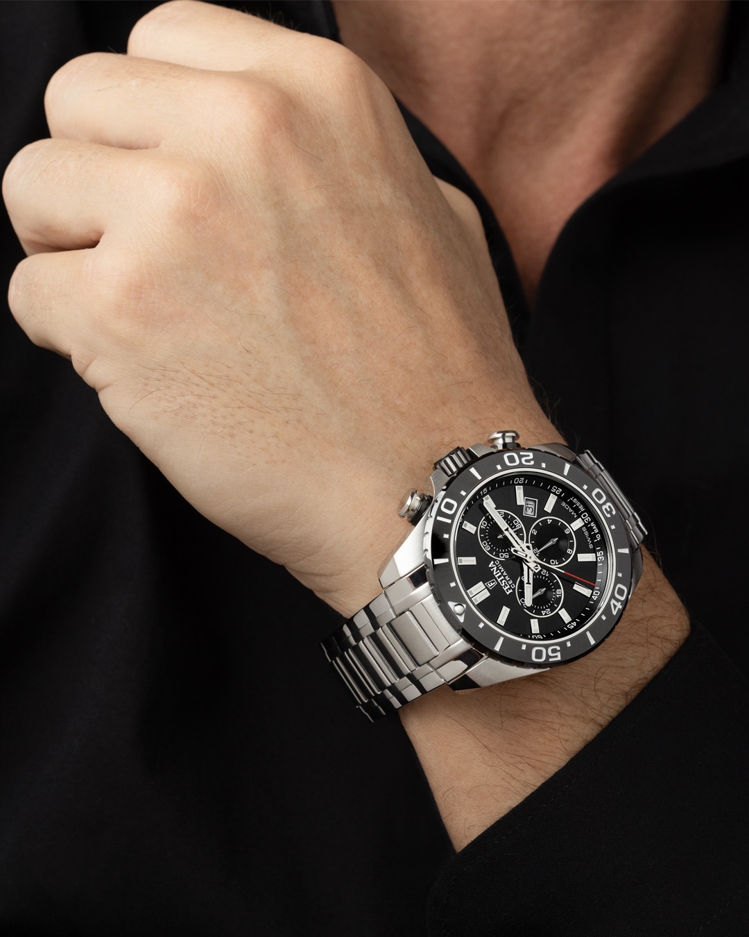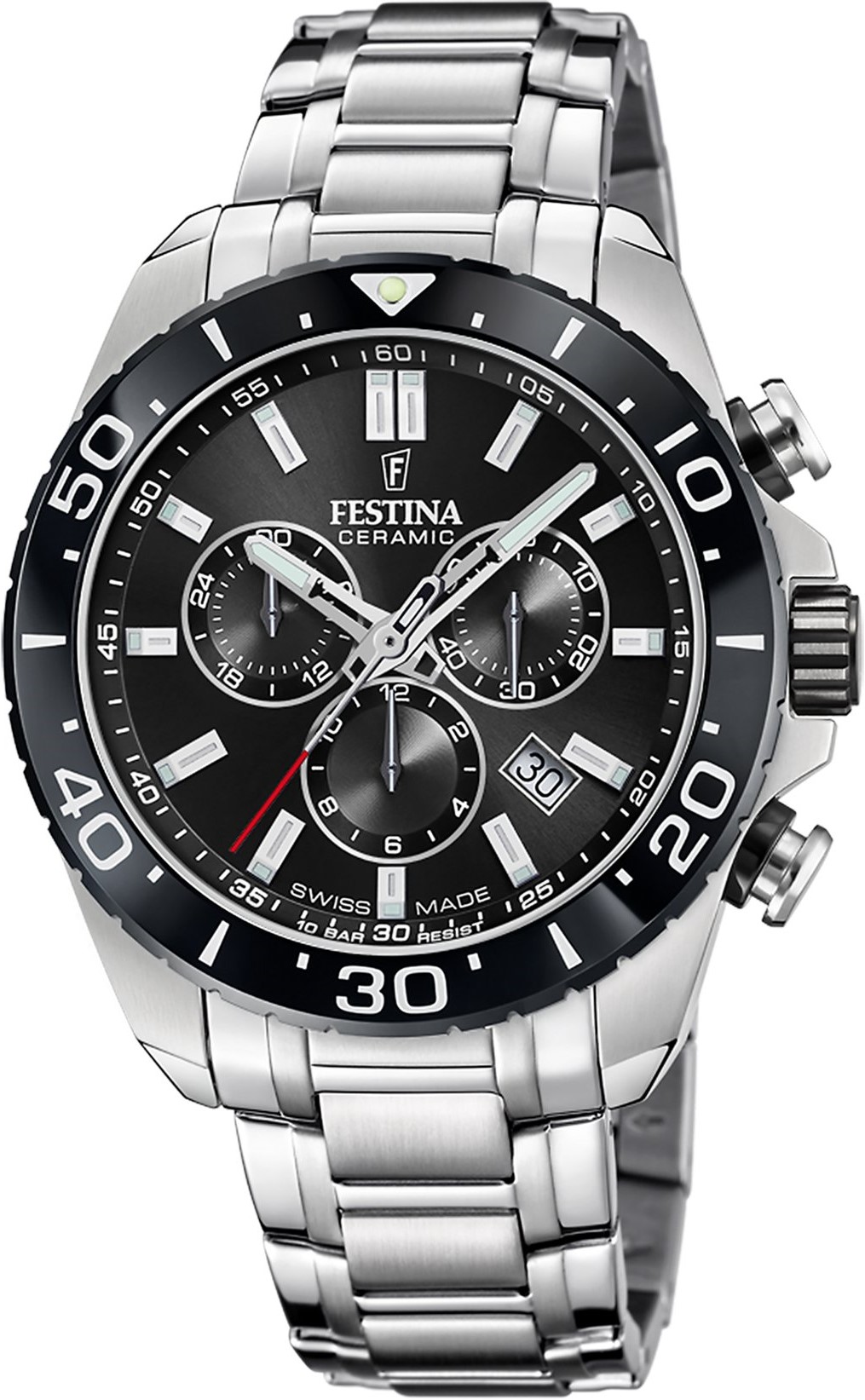 Festina Swiss Made 20042/4 sú pánske športové batériové hodinky na oceľovom náramku s preklápacou sponou. Puzdro z nerezovej ocele má priemer 44 milimetrov a čiernu keramickú lunetu s minútovou stupnicou. Čierny číselník s efektom slnečného brusu, dátumovkou a stopkami je chránený odolným zafírovým sklíčkom. Aplikované indexy majú spolu s ručičkami a bodom na lunete luminiscenčný náter, ktorý po nasvietení uľahčuje čitateľnosť za zhoršených svetelných podmienok. Chod hodiniek zaisťuje quartzový strojček Ronda 5030.D. S vodotesnosťou 10 ATM sú hodinky vhodné na plávanie či šnorchlovanie.