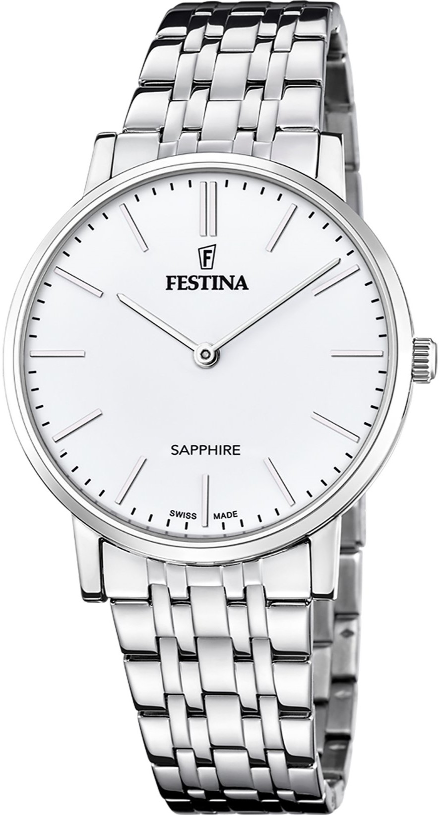 Festina Swiss Made 20045/2 sú pánske batériové hodinky v klasickom štýle na oceľovom náramku s preklápacou sponou. Puzdro z nerezovej ocele má priemer 39,3 milimetra. Prehľadný biely číselník je chránený odolným zafírovým sklíčkom. Chod hodiniek zaisťuje quartzový strojček Ronda 762-H1. S vodotesnosťou 5 ATM sú hodinky odolné proti dažďu a pri sprchovaní.