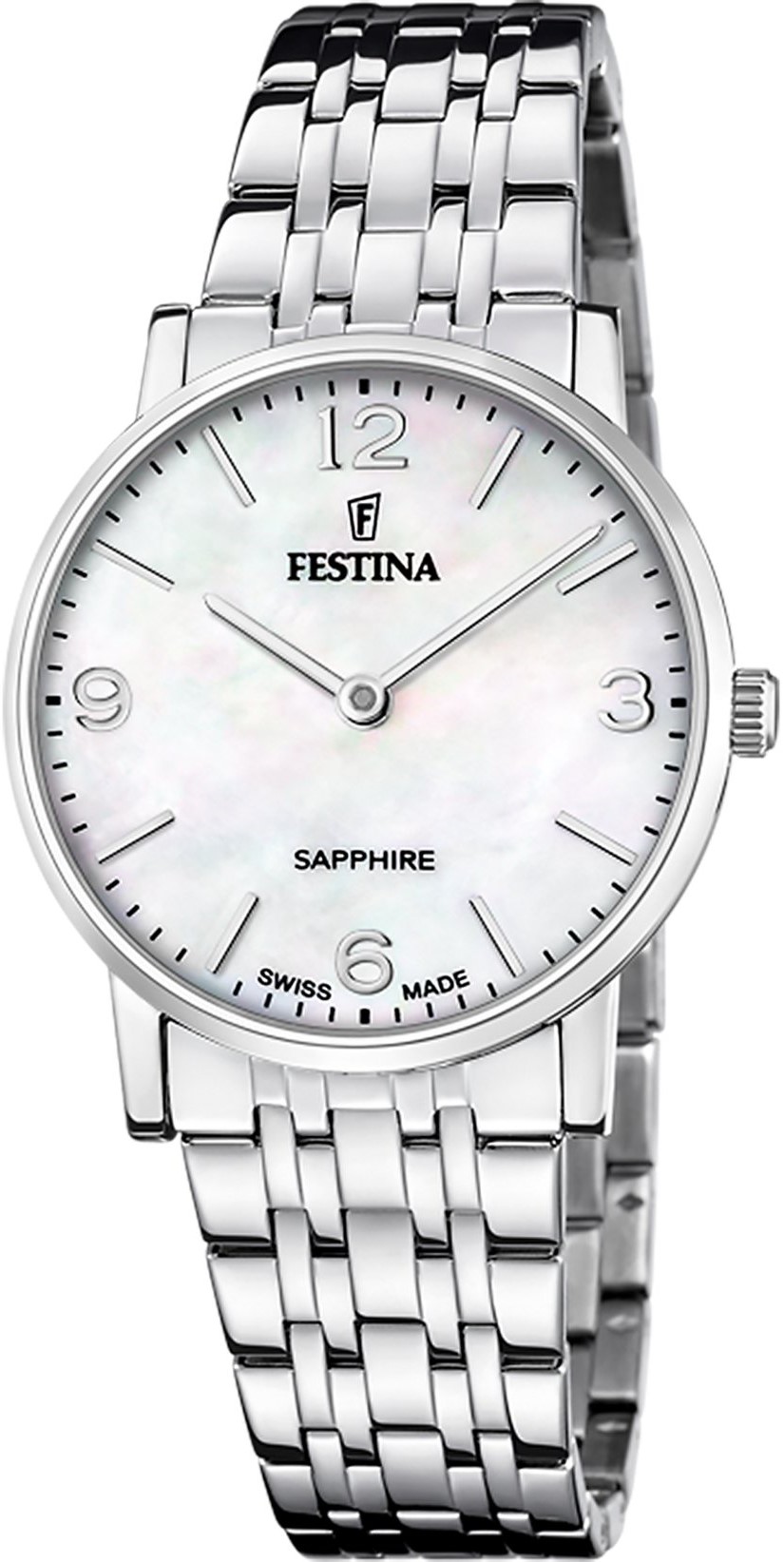 Festina Swiss Made 20047/2 sú dámske batériové hodinky v klasickom štýle na oceľovom náramku s preklápacou sponou. Puzdro z nerezovej ocele má priemer 29,3 milimetra. Prehľadný perleťový číselník je chránený odolným zafírovým sklíčkom a jeho krása vyniká najmä pod priamym svetlom, kedy môžeme pozorovať hru farieb perlete. Chod hodiniek zaisťuje quartzový strojček Ronda 762-H1. S vodotesnosťou 5 ATM sú hodinky odolné proti dažďu a pri sprchovaní.