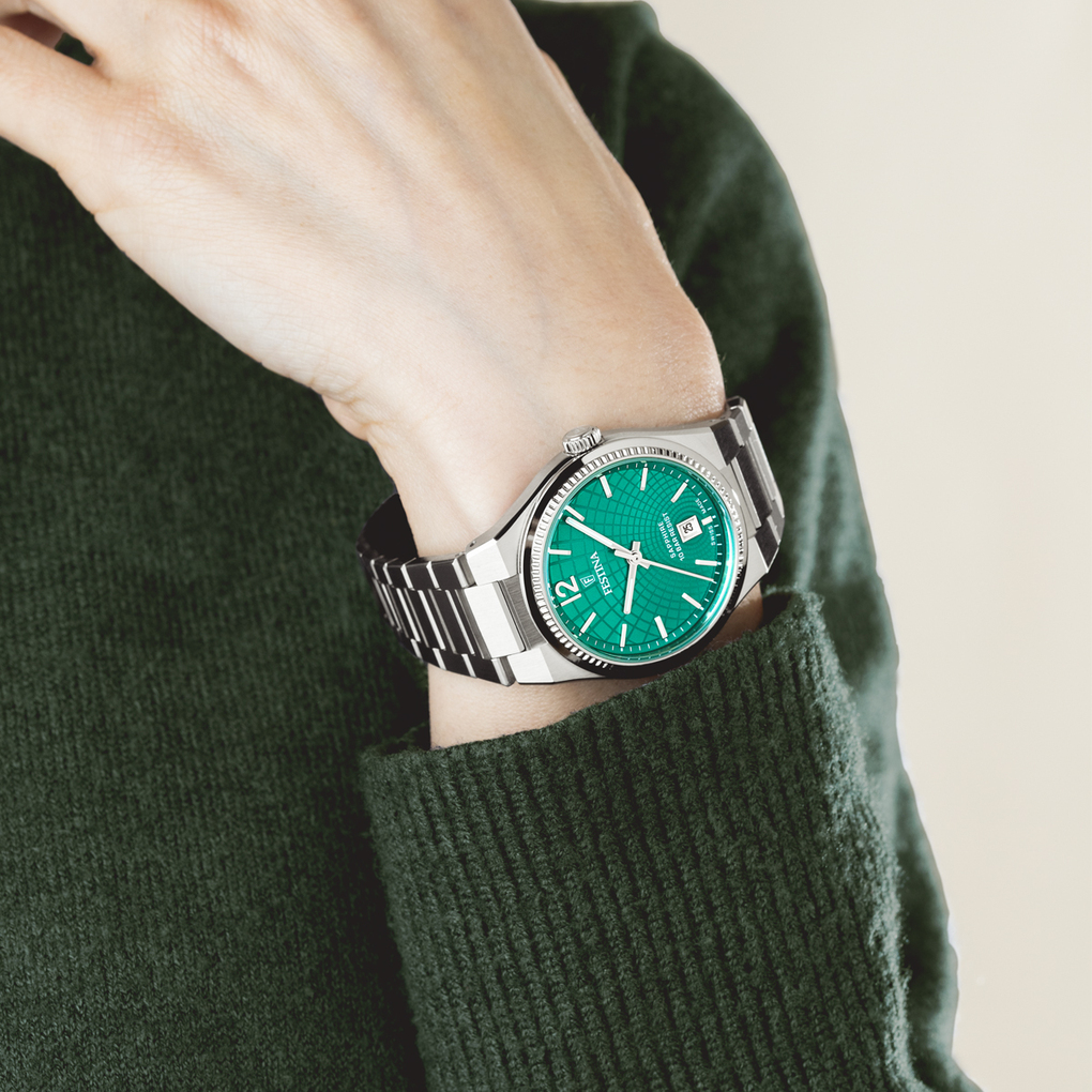 Festina Swiss Made 20052/6 sú dámske batériové hodinky v klasickom štýle na oceľovom náramku s motýlikovou sponou. Puzdro z nerezovej ocele má priemer 35 milimetrov. Zelený štrukturovaný číselník s ukazovateľom dátumu na šiestej hodine je chránený odolným zafírovým sklíčkom a jeho krása vyniká najmä pod priamym svetlom, kedy môžeme pozorovať hru farieb perlete. Ručičky a niektoré indexy majú luminiscenčný náter, ktorý po nasvietení uľahčuje čitateľnosť za zhoršených svetelných podmienok. Chod hodiniek zaisťuje quartzový strojček Ronda 705. S vodotesnosťou 10 ATM sú hodinky vhodné na plávanie či šnorchlovanie.