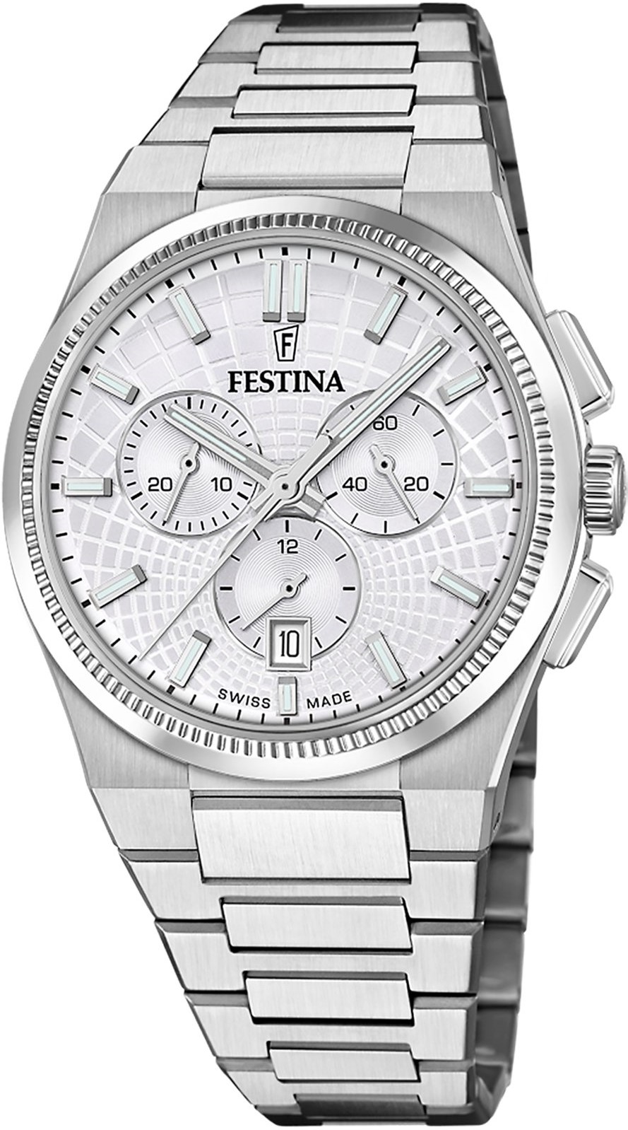 Festina Swiss Made 20059/1 sú pánske batériové športové hodinky na oceľovom náramku s motýlikovou sponou. Puzdro z nerezovej ocele má priemer 42,5 milimetra. Strieborný štruktúrovaný číselník s ukazovateľom dátumu a stopkami je chránený odolným zafírovým sklíčkom. Ručičky a indexy majú luminiscenčný náter, ktorý po nasvietení uľahčuje čitateľnosť za zhoršených svetelných podmienok. Chod hodiniek zaisťuje quartzový strojček Ronda 5030D. S vodotesnosťou 10 ATM sú hodinky vhodné na plávanie či šnorchlovanie.