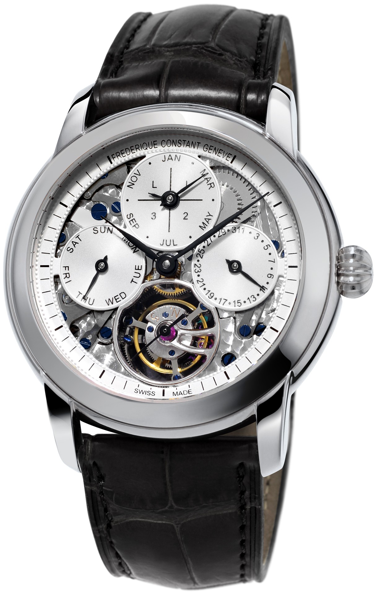 27 kalibr značky Frederique Constant, tentokrát s manufakturním tourbillonem a věčným kalendářem v limitované edici pouhých 88 kusů na celý svět. Krokový mechanismus je vzrobený z křemíku, díky čemuž je velice lehký, antimagnetický a nevyžaduje mazání.