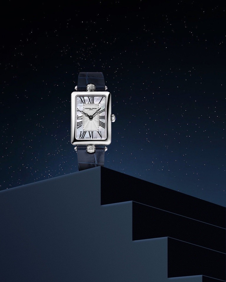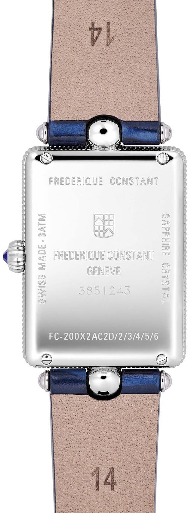 Frederique Constant Classics Art Deco Carrée FC-200MPW2AC2D6 sú dámske batériové hodinky na modrom koženom remienku s tŕňovou sponou. Hranaté puzdro z nerezovej ocele osadené 18 diamantmi s hmotnosťou 0,11 ct má priemer 20,7 milimetra a korunku zdobenú modrým kabošonom. Tieto elegantné hodinky sú vhodnou voľbou na každodenné nosenie. Číselník so strieborným stredom zdobeným gilošom s kontrastnými brequet rúčkami je chránený odolným zafírovým sklom. Čierne hodinové indexy v tvare rímskych číslic sú podčiarknuté perleťovým obvodom číselníka, ktorého krása vyniká najmä pod priamym svetlom, kedy môžeme pozorovať hru farieb perlete. Pohon hodiniek zaisťuje spoľahlivý quartzový strojček FC-200 (základom je strojček Ronda 1062). S vodotesnosťou 3 ATM sú hodinky odolné proti vlhkosti a dažďu.