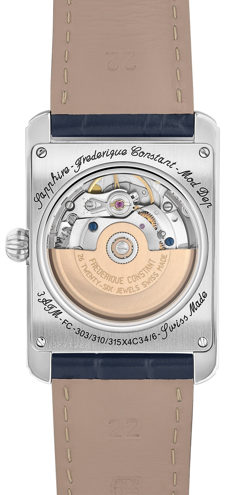 Frederique Constant Classics Carrée Heart Beat Automatic FC-311N4C6 sú pánske automatické hodinky na modrom koženom remienku s tŕňovou sponou. Hranaté puzdro z nerezovej ocele má rozmery 30,4 x 33,3 milimetra, priehľadné viečko a zdobenú korunku. Tieto elegantné hodinky využijete na každodenné nosenie. Modrý číselník s efektom slnečného brusu, priehľadom na samotné srdce strojčeka (zotrvačku) a stredom zdobeným gilošom je chránený odolným zafírovým sklom. Aplikované hodinové indexy dopĺňajú elegantné dauphine ručičky. Pohon hodiniek zaisťuje mechanický strojček FC-311 s automatickým náťahom a rezervou chodu približne 38 hodín. Základom kalibru je Sellita SW200. Tento strojček s funkciou hackingu je možné v prípade potreby naťahovať aj ručne pomocou korunky. S vodotesnosťou 3 ATM sú hodinky odolné proti vlhkosti a dažďu.