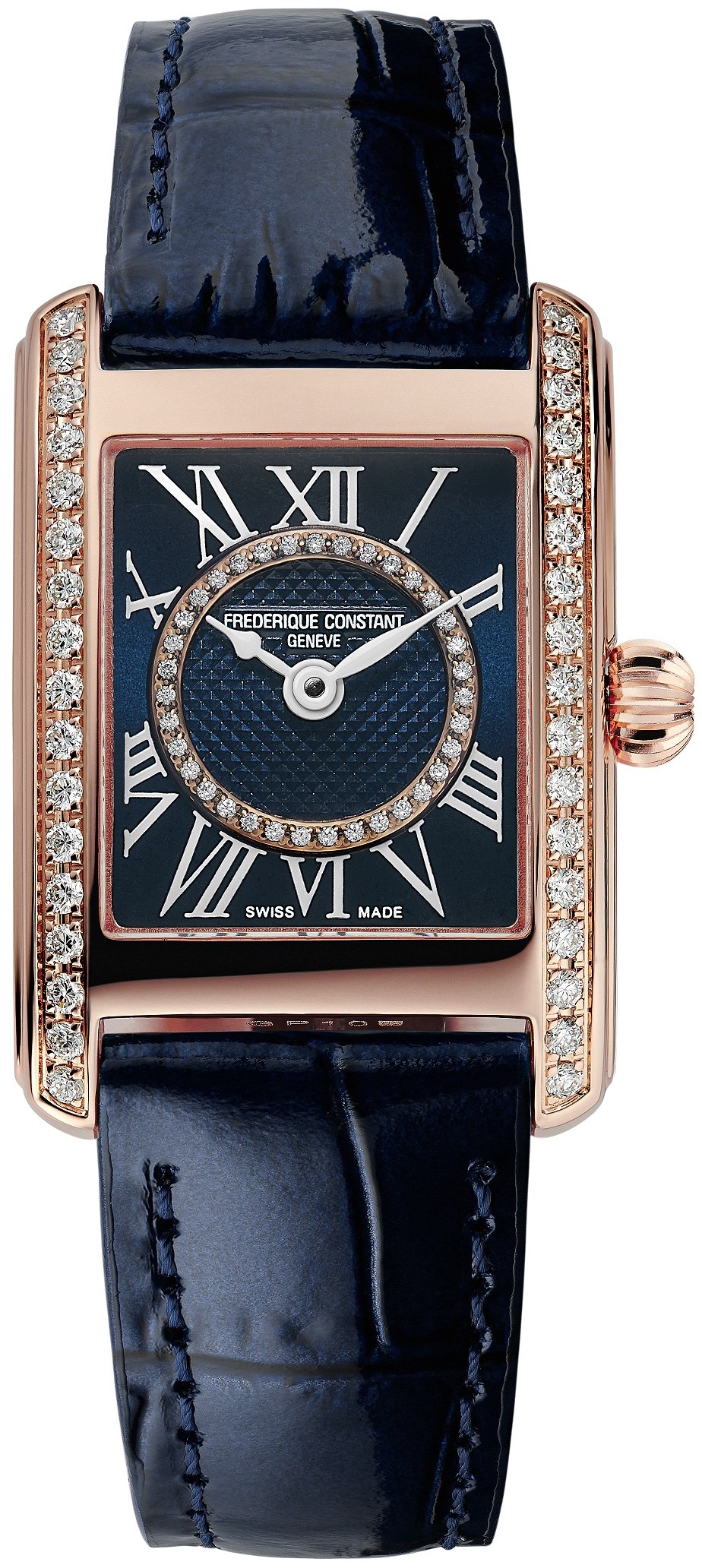 Frederique Constant Classics Carrée Ladies FC-200NMCDCD14 sú dámske elegantné batériové hodinky na modrom koženom remienku s tŕňovou sponou. Hranaté puzdro z nerezovej ocele s PVD úpravou vo farbe ružového zlata má rozmery 21 x 23 milimetrov a je zdobené 34 diamantmi s hmotnosťou 0,4 ct. Modrý číselník so stredom s gilošou s textúrou „clous de Paris” ohraničeným 35 diamantmi s hmotnosťou 0,06 ct je chránený odolným zafírovým sklom. Biele hodinové indexy v tvare rímskych číslic dopĺňajú elegantné pikové ručičky v identickej farbe. Pohon hodiniek zaisťuje spoľahlivý quartzový strojček FC-200, ktorého základom je Ronda 1062. S vodotesnosťou 3 ATM sú hodinky odolné proti vlhkosti a dažďu.