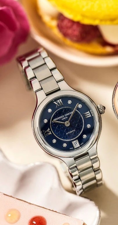 Frederique Constant Classics Delight FC-306NHD3ER6B jsou dámské automatické hodinky na ocelovém náramku s motýlkovou sponou. Pouzdro z nerezové oceli má průměr 33 milimetrů a korunku zdobenou modrým kabošonem. Tyto hodinky v klasickém designu využijete pro každodenní nošení. Modrý perleťový číselník s texturovaným středem je chráněn odolným safírovým sklem a jeho krása vyniká zejména pod přímým světlem, kdy můžeme pozorovat hru barev perleti. Aplikované hodinové indexy ve tvaru římských číslic doplňují elegantní mečovité ručky a 8 diamantů o hmotnosti 0,01 ct. Pohon hodinek zajišťuje mechanický strojek FC-306 s automatickým nátahem a rezervou chodu přibližně 42 hodin. Základem kalibru je Sellita SW300. Tento strojek s funkcí hackingu lze v případě potřeby natahovat i ručně pomocí korunky. S vodotěsností 3 ATM jsou hodinky odolné proti vlhkosti a dešti.