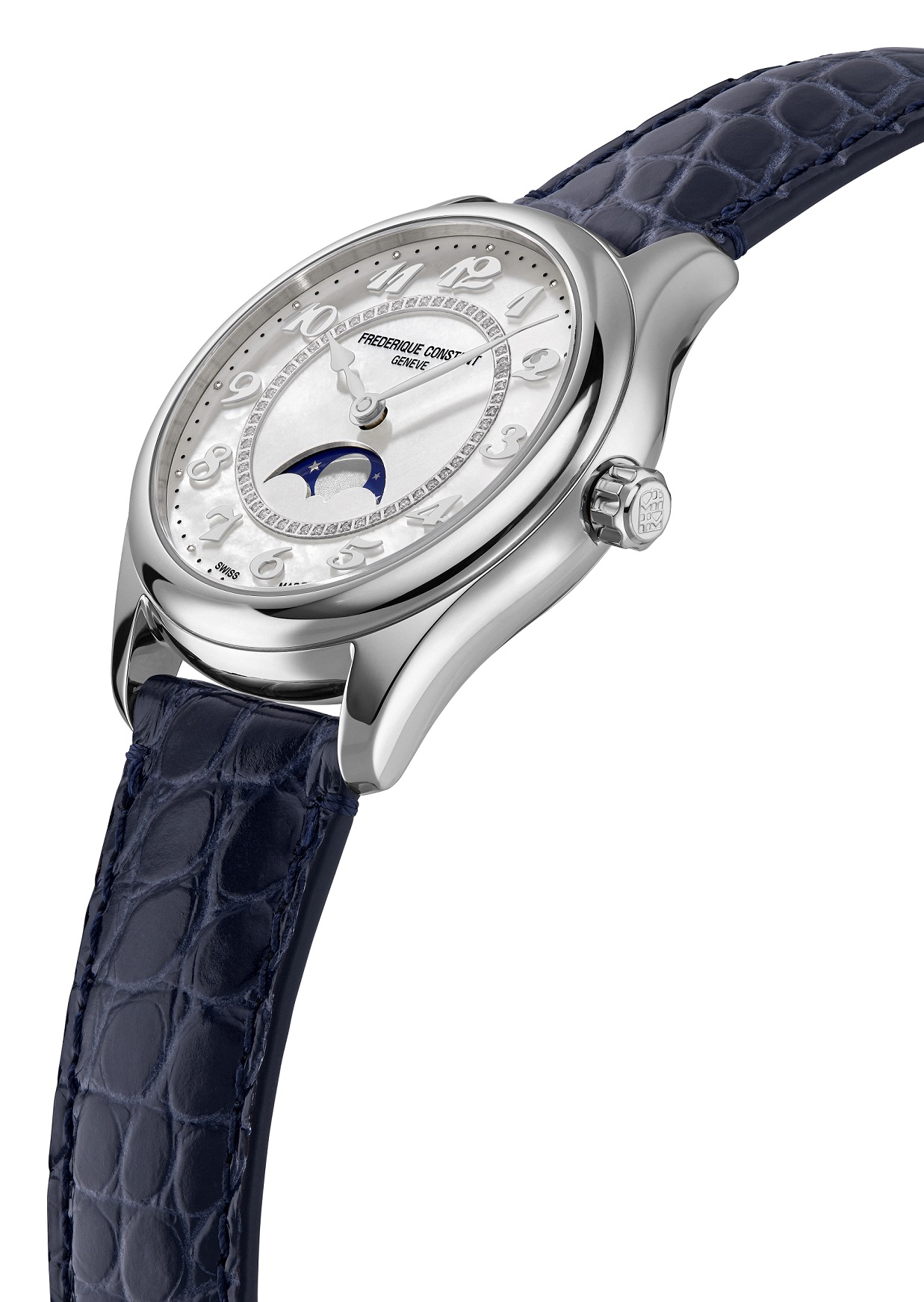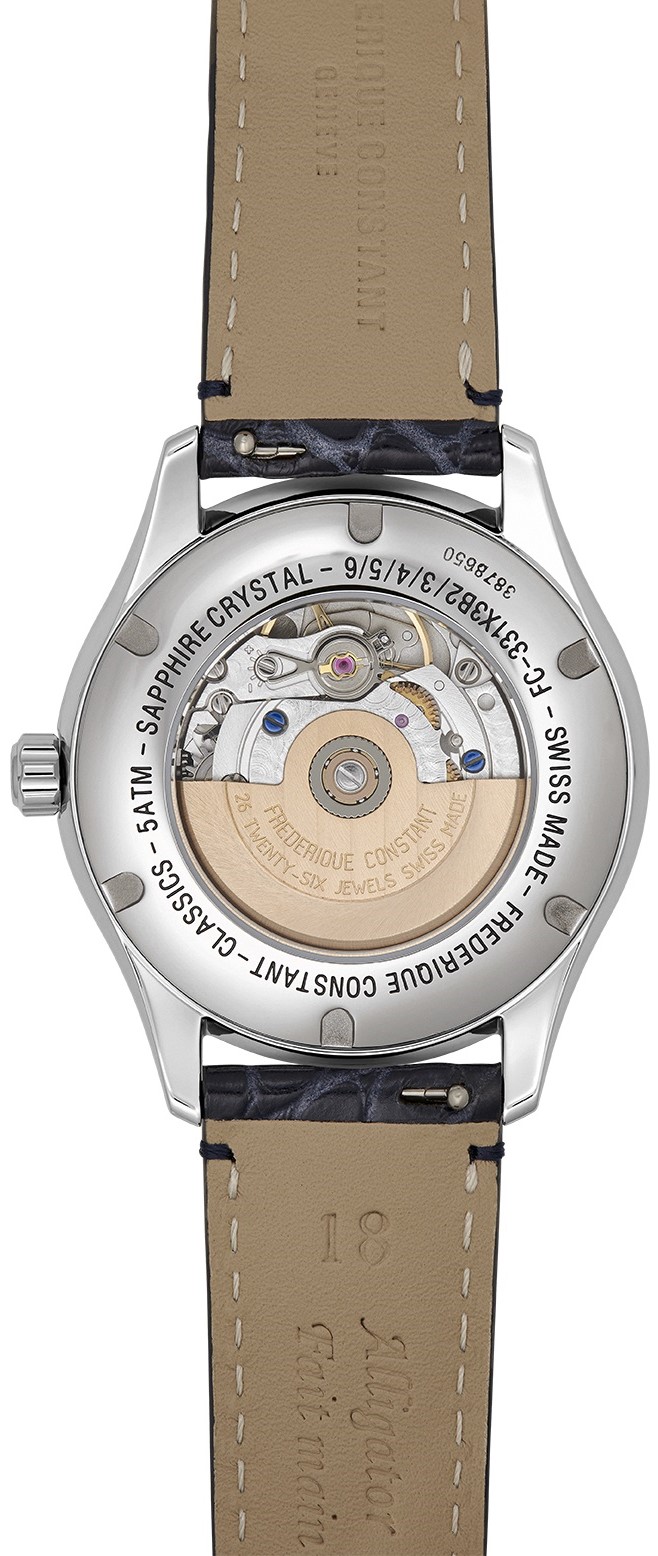 Frederique Constant Classics Elegance FC-331MPWD3B6 sú dámske automatické hodinky na modrom remienku z aligátora kože s preklápacou sponou. Puzdro z nerezovej ocele má priemer 36 milimetrov, priehľadné viečko a signovanú korunku. Tieto elegantné hodinky sú vhodnou voľbou na každodenné nosenie. Perleťový číselník s ukazovateľom mesačnej fázy a 56 diamantmi s hmotnosťou 0,7 ct je chránený odolným zafírovým sklom a jeho krása vyniká najmä pod priamym svetlom, kedy môžeme pozorovať hru farieb perlete. Aplikované hodinové indexy dopĺňajú elegantné listové rúčky. Pohon hodiniek zaisťuje mechanický strojček FC-331 s automatickým náťahom a rezervou chodu približne 38 hodín. Základom kalibru je Sellita SW280. Tento strojček s funkciou hackingu je možné v prípade potreby naťahovať aj ručne pomocou korunky. S vodotesnosťou 5 ATM sú hodinky odolné proti dažďu a pri sprchovaní.