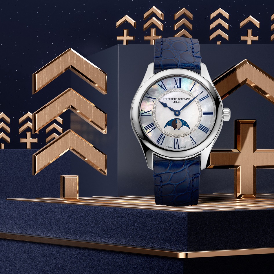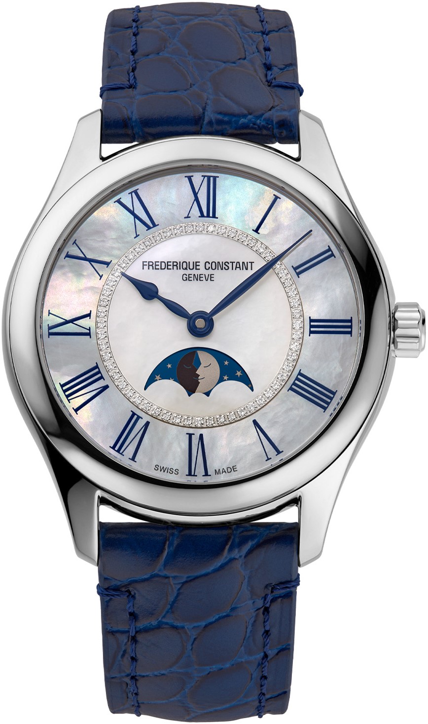 Frederique Constant Classics Elegancia Luna FC-331MPWND3B6 sú dámske automatické hodinky na modrom koženom remienku s preklápacou sponou. Puzdro z nerezovej ocele má priemer 36 milimetrov, priehľadné viečko a signovanú korunku. Tieto elegantné hodinky sú vhodnou voľbou na každodenné nosenie. Perleťový číselník s ukazovateľom mesačnej fázy a 56 diamantmi s hmotnosťou 0,7 ct je chránený odolným zafírovým sklom s antireflexnou vrstvou a jeho krása vyniká najmä pod priamym svetlom, kedy môžeme pozorovať hru farieb perlete. Aplikované hodinové indexy v podobe rímskych číslic dopĺňajú elegantné listové ručičky. Pohon hodiniek zaisťuje mechanický strojček FC-331 s automatickým náťahom a rezervou chodu približne 38 hodín. Základom kalibru je Sellita SW280. Tento strojček s funkciou hackingu je možné v prípade potreby naťahovať aj ručne pomocou korunky. S vodotesnosťou 5 ATM sú hodinky odolné proti dažďu a pri sprchovaní.