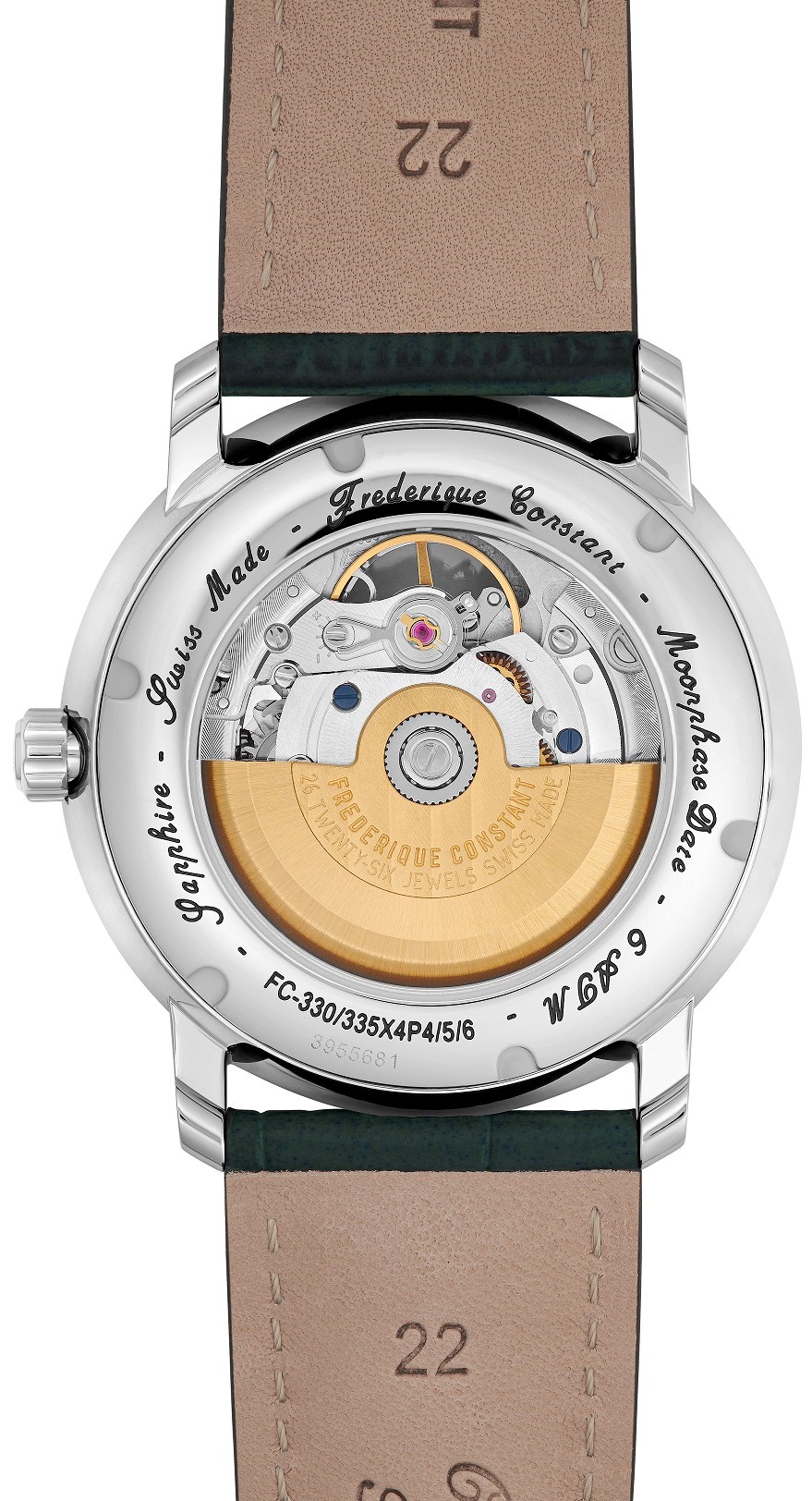 Frederique Constant Classic Heart Beat Moonphase FC-335MCGRW4P26 sú pánske automatické hodinky na zelenom koženom remienku s bielym prešívaním a tŕňovou sponou. Puzdro z nerezovej ocele má priemer 40 milimetrov, priehľadné viečko a signovanú korunku. Tieto elegantné hodinky sú vhodnou voľbou na každodenné nosenie. Zelený číselník s priehľadom na samotné srdce strojčeka (zotrvačku), stredom zdobeným gilošom s textúrou „clous de Paris” a ukazovateľom mesačnej fázy je chránený odolným zafírovým sklom. Číselník ďalej disponuje ukazovateľom dátumu po jeho obvode formou centrálnej rúčky. Biele hodinové indexy v tvare rímskych číslic dopĺňajú breguet ručičky v identickej farbe. Pohon hodiniek zaisťuje mechanický strojček FC-335 s automatickým náťahom a rezervou chodu približne 38 hodín. Základom tohto kalibru je Sellita SW200. Tento strojček s funkciou hackingu je možné v prípade potreby naťahovať aj ručne pomocou korunky. S vodotesnosťou 6 ATM sú hodinky odolné proti dažďu a pri sprchovaní.