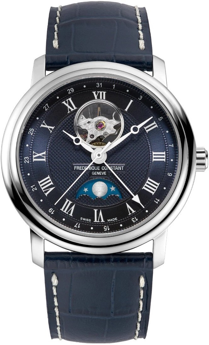 Frederique Constant Classic Heart Beat Moonphase FC-335MCNW4P26 sú pánske automatické hodinky na modrom koženom remienku s bielym prešívaním a tŕňovou sponou. Puzdro z nerezovej ocele má priemer 40 milimetrov, priehľadné viečko a signovanú korunku. Tieto elegantné hodinky sú vhodnou voľbou na každodenné nosenie. Modrý číselník s priehľadom na samotné srdce strojčeka (zotrvačku), stredom zdobeným gilošom s textúrou „clous de Paris” a ukazovateľom mesačnej fázy je chránený odolným zafírovým sklom. Číselník ďalej disponuje ukazovateľom dátumu po jeho obvode formou centrálnej rúčky. Biele hodinové indexy v tvare rímskych číslic dopĺňajú breguet rúčky v identickej farbe. Pohon hodiniek zaisťuje mechanický strojček FC-335 s automatickým náťahom a rezervou chodu približne 38 hodín. Základom tohto kalibru je Sellita SW200. Tento strojček s funkciou hackingu je možné v prípade potreby naťahovať aj ručne pomocou korunky. S vodotesnosťou 6 ATM sú hodinky odolné proti dažďu a pri sprchovaní.