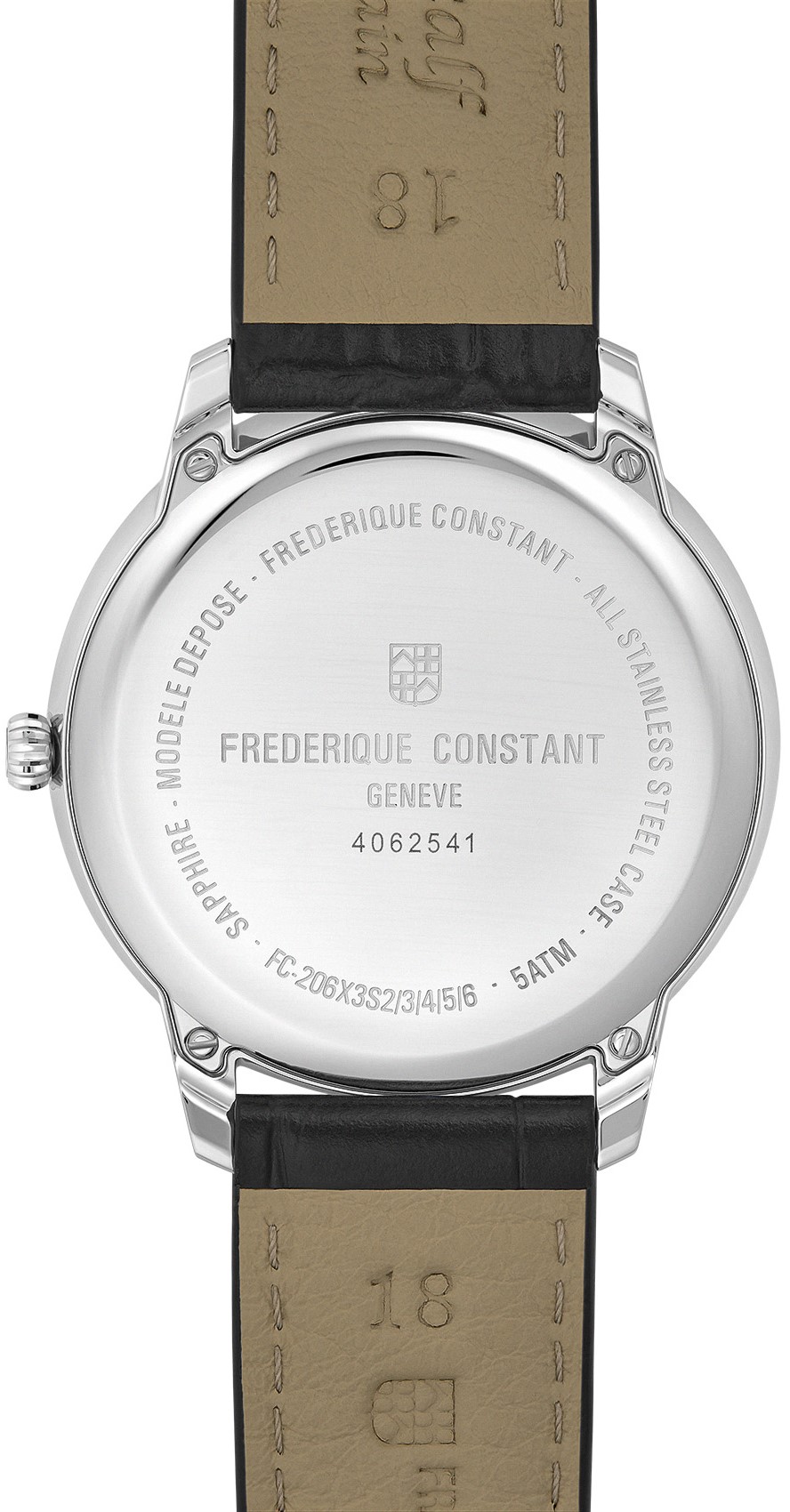 Frederique Constant Classics Quartz Moonphase FC-206B3S6 sú batériové unisex hodinky na čiernom koženom remienku s tŕňovou sponou. Puzdro z nerezovej ocele má priemer 37 milimetrov a signovanú korunku. Tieto elegantné hodinky sú vhodnou voľbou na každodenné nosenie. Čierny číselník s efektom slnečného brusu a indikáciou mesačnej fázy je chránený odolným zafírovým sklom. Pohon hodiniek zaisťuje spoľahlivý quartzový strojček FC-206 (základom je strojček Ronda 706). Vodotesnosť hodiniek je 5 ATM a sú teda odolné proti dažďu a pri sprchovaní.