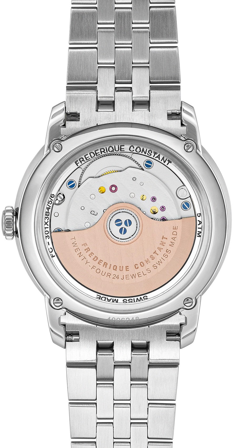 Frederique Constant Classics Premiere FC-301SAL3B6B sú automatické unisex hodinky v klasickom štýle na oceľovom náramku v kombinácii brusu a lesku s motýlikovou sponou. Puzdro z nerezovej ocele má priemer 38,5 milimetra a priehľadné viečko. Tieto hodinky sú vhodnou voľbou na každodenné nosenie. Číselník vo farbe ružového zlata s efektom slnečného brusu a textúrovaným stredom je chránený odolným zafírovým sklom. Aplikované hodinové indexy v tvare arabských číslic dopĺňajú elegantné breguet ručičky v striebornej farbe. Pohon hodiniek zaisťuje mechanický stroj FC-301 s automatickým náťahom a rezervou chodu približne 68 hodín. Základom kalibru je La Joux-Perret LJPG100. Tento strojček s funkciou hackingu je možné v prípade potreby naťahovať aj ručne pomocou korunky. Vodotesnosť hodiniek robí 5 ATM a sú teda odolné proti dažďu a pri sprchovaní.
