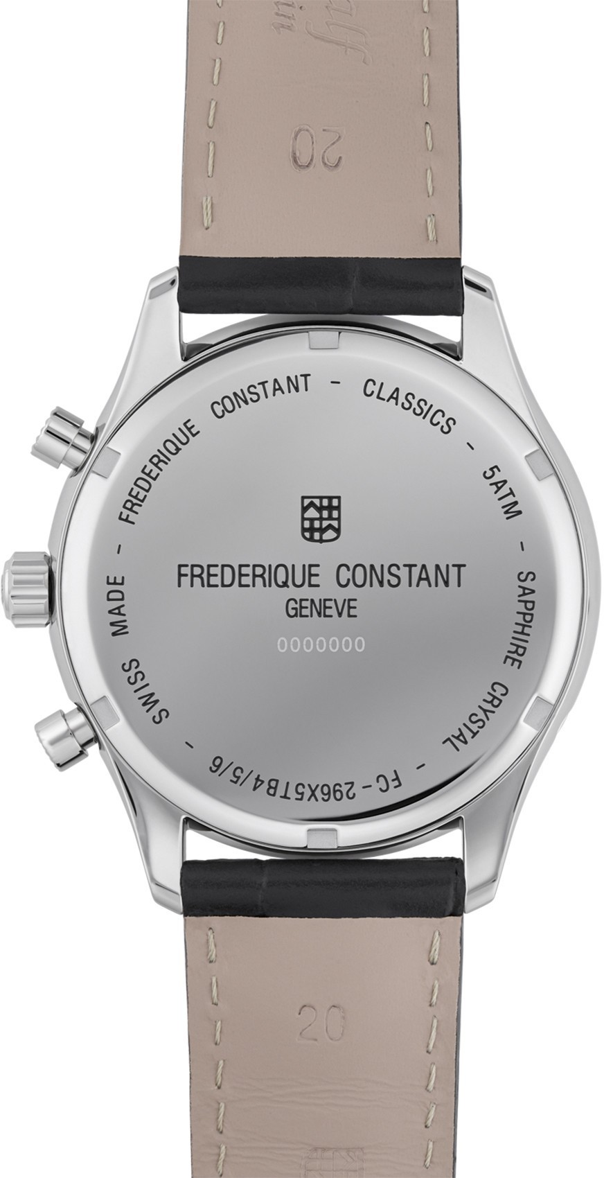Frederique Constant Classics Quartz Chronograph Triple Calendar FC-296SW5B6 sú pánske batériové hodinky na čiernom koženom remienku s tŕňovou sponou. Puzdro z nerezovej ocele má priemer 40 milimetrov a signovanú korunku. Tieto športovo elegantné hodinky sú vhodnou voľbou na každodenné nosenie. Biely číselník s indikáciou dňa v týždni a mesiaca na dvanástej hodine je chránený odolným zafírovým sklom. Ďalej číselník disponuje subciferníkmi chronografu a ukazovateľom dátumu po jeho obvode formou rúčky s výraznou červenou koncovkou. Pohon hodiniek zaisťuje spoľahlivý quartzový strojček FC-296 (základom je strojček Ronda 5040.F). S vodotesnosťou 5 ATM sú hodinky odolné proti dažďu a pri sprchovaní.