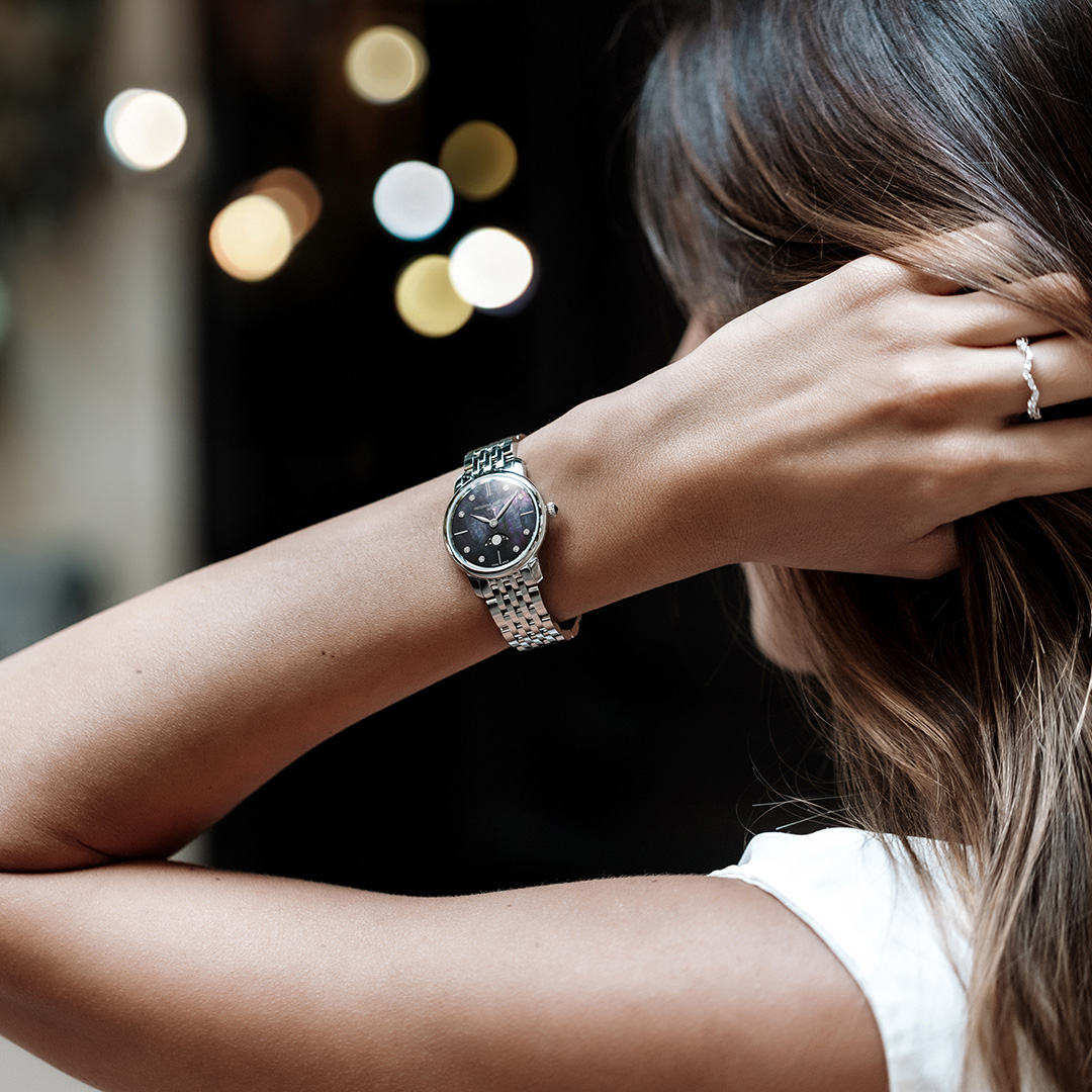 Frederique Constant Classics Slimline Ladies Moonphase FC-206MPBD1S6B sú dámske batériové hodinky na oceľovom náramku s motýlikovou sponou. Puzdro z nerezovej ocele má priemer 30 milimetrov, hrúbku pohodlných 7,65 milimetra a korunku zdobenú modrým kabošonom. Tieto hodinky v klasickom dizajne využijete na každodenné nosenie. Modrý perleťový číselník s ukazovateľom mesačnej fázy na šiestej hodine je chránený odolným zafírovým sklom a jeho krása vyniká najmä pod priamym svetlom, kedy môžeme pozorovať hru farieb perlete. Aplikované hodinové indexy dopĺňajú elegantné listové ručičky a 8 diamantov s hmotnosťou 0,04 ct. Pohon hodiniek zaisťuje spoľahlivý quartzový strojček FC-206 (základom kalibru je strojček Ronda 706). S vodotesnosťou 3 ATM sú hodinky odolné proti vlhkosti a dažďu.