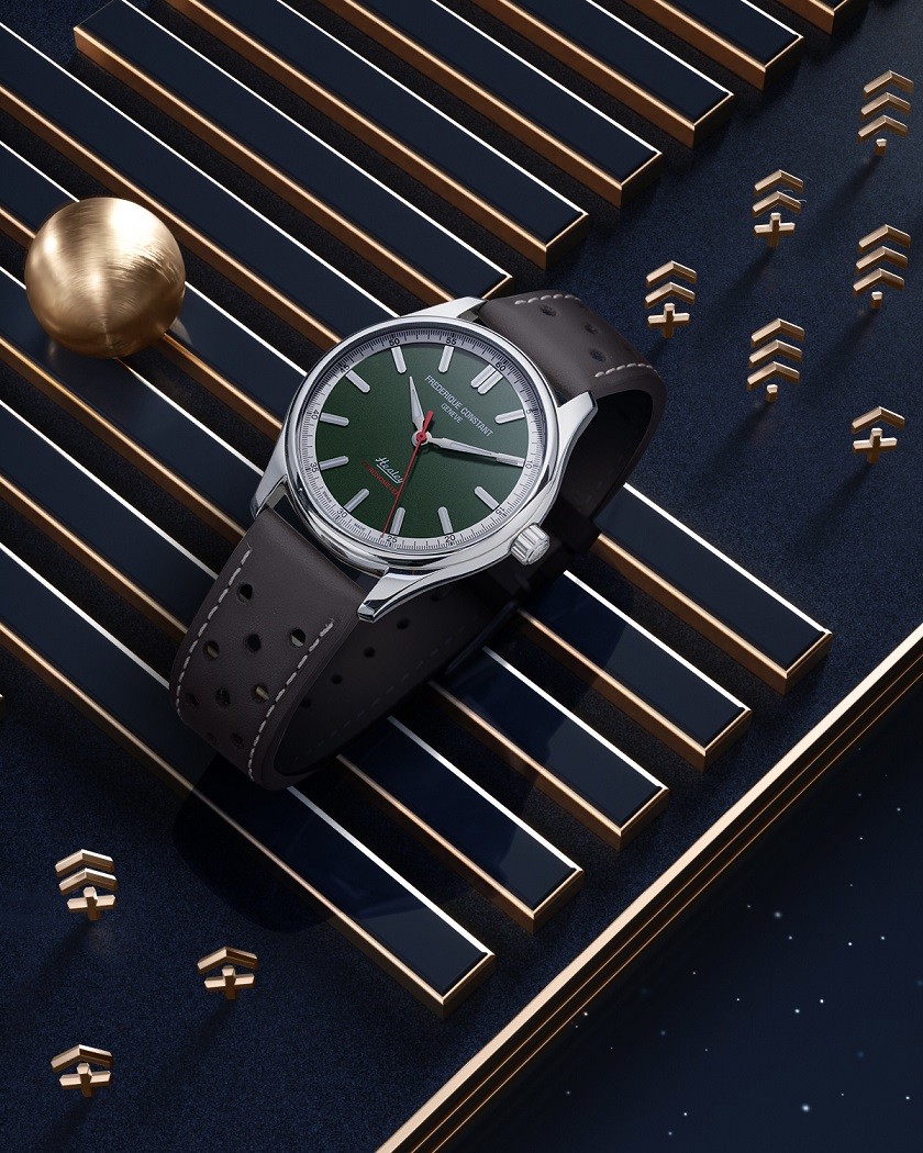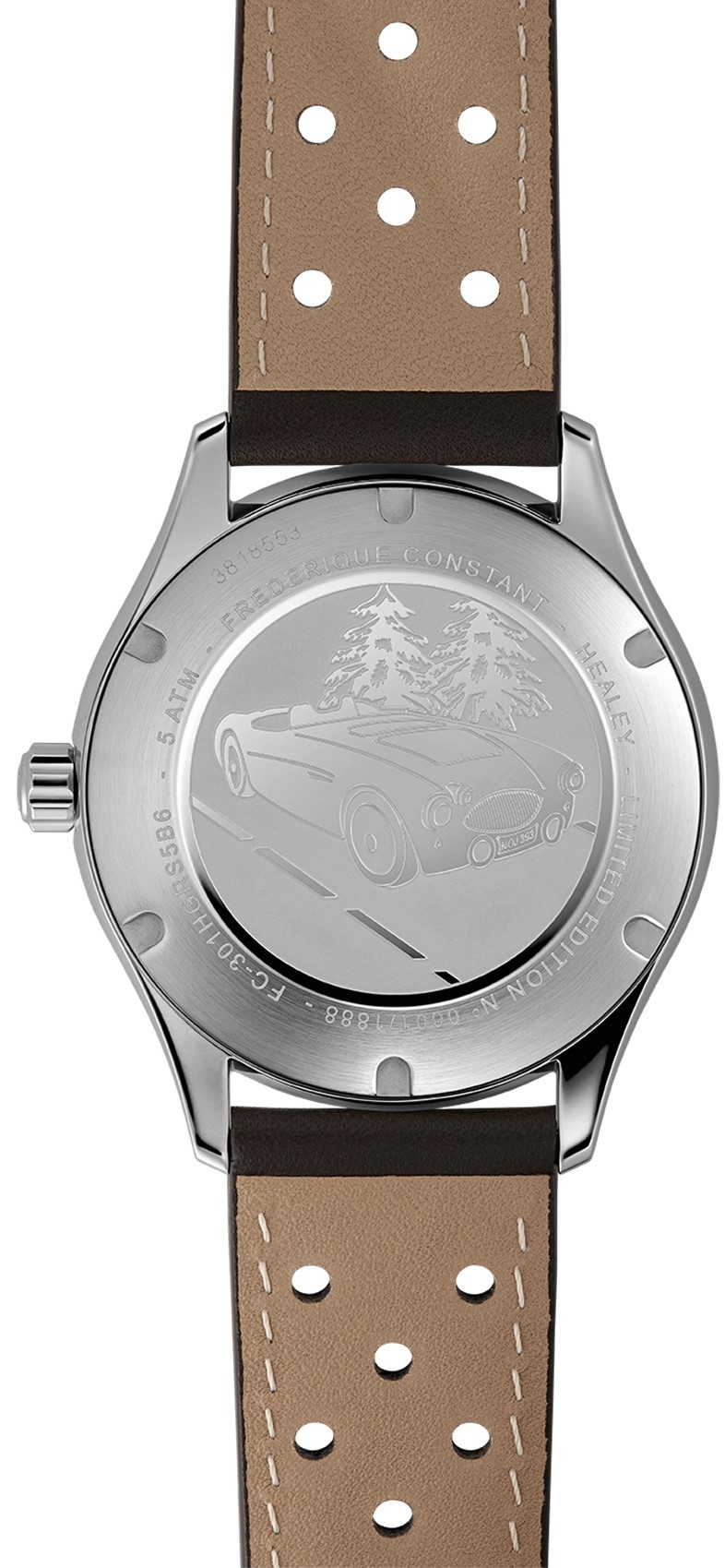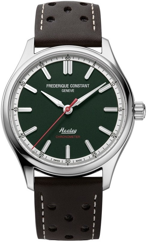 Frederique Constant Classic Vintage Rally Healey Limited Edition FC-301HGRS5B6 sú pánske automatické hodinky na hnedom športovom koženom remienku s kontrastným prešívaním a tŕňovou sponou. Puzdro z nerezovej ocele má priemer 40 milimetrov, viečko s vyobrazeným automobilom Healey NOJ393 a signovanú korunku. Jedná sa o limitovanú edíciu v počte 1888 kusov pre celý svet, ktorú Frederique Constant podporuje veteránske rely preteky. Tieto športovo elegantné hodinky sú vhodnou voľbou na každodenné nosenie. Zelený číselník je chránený odolným zafírovým sklom. Aplikované hodinové indexy sú spoločne s rúčkami pokryté luminiscenčným náterom Super-LumiNova®, ktorý garantuje perfektnú čitateľnosť za zhoršených svetelných podmienok. Sekundová rúčka hodiniek je vyvedená v kontrastnej červenej farbe.