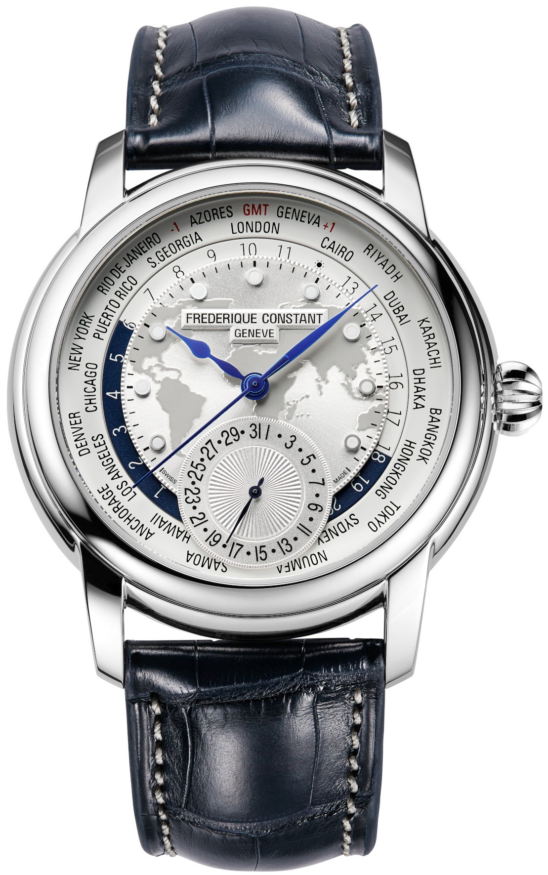 Frederique Constant Classics Worldtimer Manufacture FC-718WM4H6 jsou pánské automatické hodinky na modrém řemínku z aligátoří kůže s kontrastním prošíváním a překlápěcí sponou. Pouzdro z nerezové oceli má průměr 42 milimetrů, průhledné dýnko a zdobenou korunku. Stříbrný číselník s motivem mapy světa a indikací data na šesté hodině je chráněn odolným safírovým sklem s antireflexní vrstvou. Obvod číselníku zobrazuje funkci světového času v podobě otočného disku, pomocí kterého lze odečítat čas napříč časovými zónami. Ukazatel dne a noci vyveden také formou otočného disku je blíže ke středu číselníku. Aplikované hodinové indexy jsou pokryty luminiscenčním nátěrem Super-LumiNova®, který garantuje perfektní čitelnost za zhoršených světelných podmínek. Pohon hodinek zajišťuje manufakturní strojek FC-718 s automatickým nátahem a rezervou chodu přibližně 38 hodin. Tento strojek s funkcí hackingu lze v případě potřeby natahovat i ručně pomocí korunky. Vodotěsnost hodinek činí 5 ATM a jsou tedy odolné proti dešti a při sprchování.
