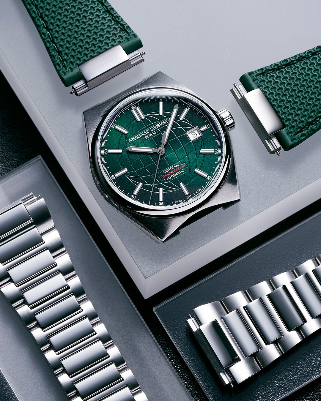 Frederique Constant Highlife Automatic COSC FC-303G3NH6B sú pánske automatické hodinky na integrovanom oceľovom náramku v kombinácii brusu a lesku s motýlikovou sponou. Puzdro z nerezovej ocele má priemer 39 milimetrov, signovanú korunku a priehľadné viečko. Tieto univerzálne hodinky v klasickom dizajne využijete na každodenné nosenie. Zelený číselník s motívom zemegule a indikáciou dátumu je chránený odolným zafírovým sklom s antireflexnou vrstvou. Aplikované hodinové indexy sú spoločne s ručičkami pokryté luminiscenčným náterom Super-LumiNova®, ktorý garantuje perfektnú čitateľnosť za zhoršených svetelných podmienok. Pohon hodiniek zaisťuje mechanický strojček FC-303 s automatickým náťahom a rezervou chodu približne 38 hodín. Základom kalibru je Sellita SW200. Tento strojček s funkciou hackingu je možné v prípade potreby naťahovať aj ručne pomocou korunky. Hodinky s C.O.S.C. certifikáciou, ktorá je zárukou vysokej presnosti, nesú označenie „Chronometer“. S vodotesnosťou 5 ATM sú odolné proti dažďu a pri sprchovaní. Súčasťou balenia je náhradný gumový remienok.