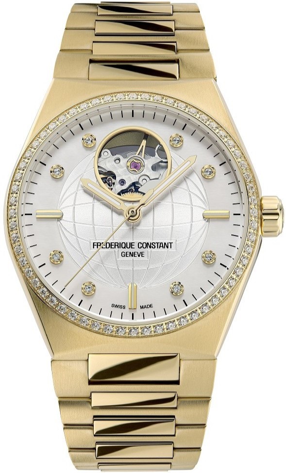 Frederique Constant Highlife Ladies Automatic Heart Beat FC-310MPWD2NHD5B sú dámske automatické hodinky na integrovanom oceľovom náramku s PVD úpravou zlatej farby a motýlikovou sponou. Puzdro z nerezovej ocele v rovnakej farbe má priemer 34 milimetrov, priehľadné viečko, signovanú korunku a lunetu osadenú 60 diamantmi s hmotnosťou 0,45 ct. Tieto univerzálne hodinky v klasickom dizajne využijete na každodenné nosenie, ale aj do spoločnosti. Perleťový číselník s motívom zemegule v striebornej farbe zdobený 8 diamantmi s hmotnosťou 0,04 ct je chránený odolným zafírovým sklom a upúta pozornosť priehľadom na samotné srdce strojčeka (zotrvačku). Aplikované hodinové indexy sú spoločne s ručičkami pokryté luminiscenčným náterom Super-LumiNova®, ktorý garantuje perfektnú čitateľnosť za zhoršených svetelných podmienok. Pohon hodiniek zaisťuje mechanický strojček FC-310 s automatickým náťahom a rezervou chodu približne 38 hodín. Základom kalibru je Sellita SW200. Tento strojček s funkciou hackingu je možné v prípade potreby naťahovať aj ručne pomocou korunky. Vodotesnosť hodiniek je 5 ATM a sú teda odolné proti dažďu a pri sprchovaní. Súčasťou balenia je náhradný gumový remienok.