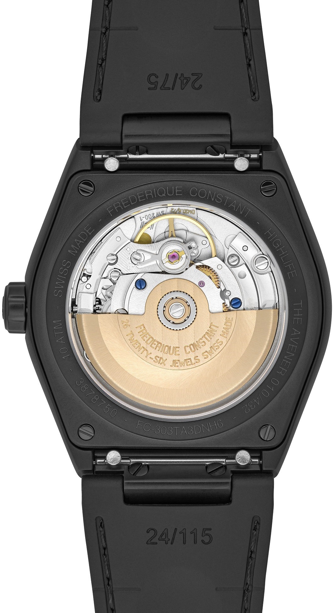 Frederique Constant Highlife Automatic x Avener Limited Edition FC-303TA3DNH6 sú pánske automatické hodinky na integrovanom čiernom kaučukovom remienku s tŕňovou sponou. Ide o limitovanú edíciu v počte 432 kusov pre celý svet, ktorá vznikla v spolupráci s francúzskym hudobníkom a DJ The Avener. Puzdro z nerezovej ocele s čiernou DLC úpravou má priemer 39 milimetrov, signovanú korunku a priehľadné viečko. Čierny číselník s motívom zvukových vĺn je chránený odolným zafírovým sklom s antireflexnou vrstvou. Aplikované hodinové indexy sú spoločne s rúčkami pokryté luminiscenčným náterom Super-LumiNova®, ktorý garantuje perfektnú čitateľnosť za zhoršených svetelných podmienok. Pohon hodiniek zaisťuje mechanický strojček FC-303 s automatickým náťahom a rezervou chodu približne 38 hodín. Základom kalibru je Sellita SW200. Tento strojček s funkciou hackingu je možné v prípade potreby naťahovať aj ručne pomocou korunky. Hodinky disponujú funkciou ukazovateľa dátumu a s vodotesnosťou 10 ATM sú vhodné na kúpanie alebo šnorchlovanie. Súčasťou balenia je náhradný kožený remienok čiernej farby.