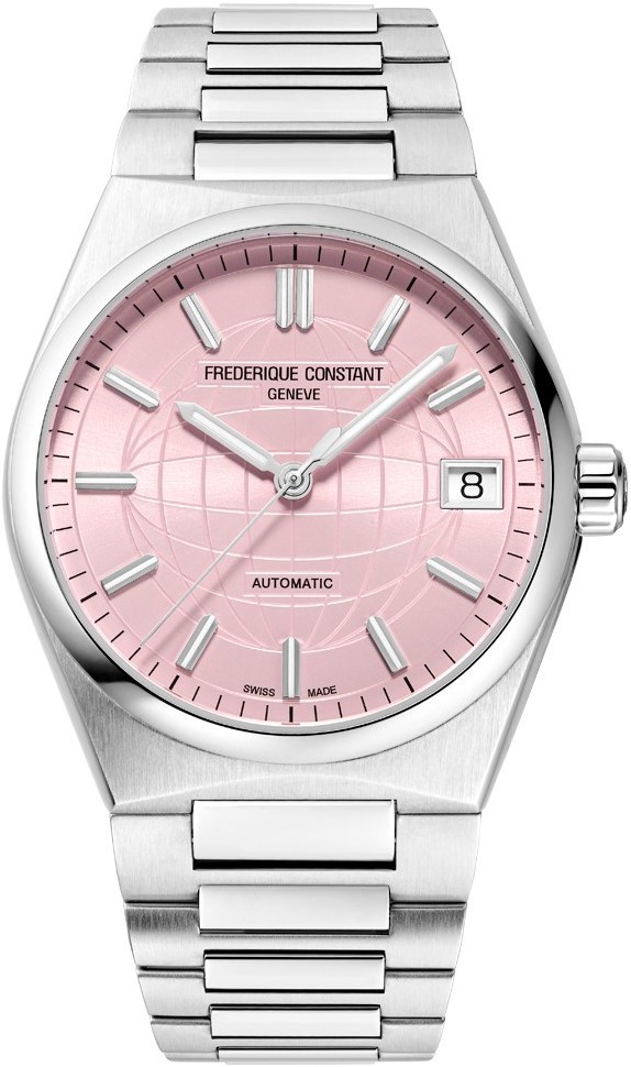 Frederique Constant Highlife Ladies Automatic FC-303LP2NH6B sú dámske automatické hodinky na integrovanom oceľovom náramku v kombinácii brusu a lesku s motýlikovou sponou. Puzdro z nerezovej ocele má priemer 34 milimetrov, signovanú korunku a priehľadné viečko. Tieto univerzálne hodinky v klasickom dizajne využijete na každodenné nosenie. Ružový číselník s motívom zemegule je chránený odolným zafírovým sklom. Aplikované hodinové indexy sú spoločne s ručičkami pokryté luminiscenčným náterom Super-LumiNova®, ktorý garantuje perfektnú čitateľnosť za zhoršených svetelných podmienok. Pohon hodiniek zaisťuje mechanický strojček FC-303 s automatickým náťahom a rezervou chodu približne 38 hodín. Základom kalibru je Sellita SW200. Tento strojček s funkciou hackingu je možné v prípade potreby naťahovať aj ručne pomocou korunky. Hodinky disponujú funkciou ukazovateľa dátumu a s vodotesnosťou 5 ATM sú odolné proti dažďu a pri sprchovaní. Súčasťou balenia je náhradný gumený remienok bielej farby.