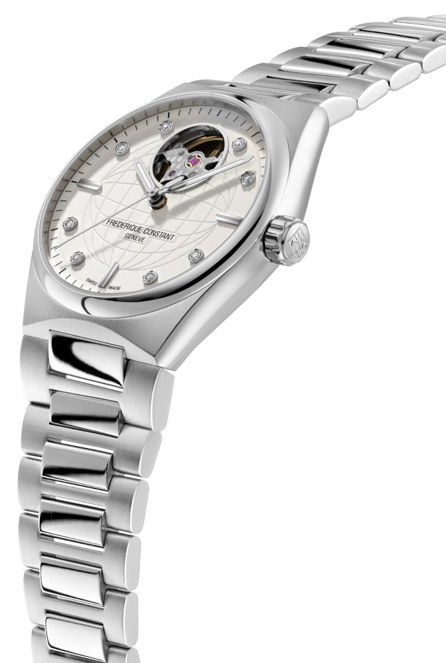 Frederique Constant Highlife Ladies Automatic Heart Beat FC-310SD2NH6B sú dámske automatické hodinky na integrovanom oceľovom náramku v kombinácii brusu a lesku s motýlikovou sponou. Puzdro z nerezovej ocele má priemer 34 milimetrov, signovanú korunku a priehľadné viečko. Tieto univerzálne hodinky v klasickom dizajne využijete na každodenné nosenie. Biely číselník s motívom zemegule zdobený 8 diamantmi s hmotnosťou 0,04 ct je chránený odolným zafírovým sklom a upúta pozornosť priehľadom na samotné srdce strojčeka (zotrvačku). Aplikované hodinové indexy sú spoločne s ručičkami pokryté luminiscenčným náterom Super-LumiNova®, ktorý garantuje perfektnú čitateľnosť za zhoršených svetelných podmienok. Pohon hodiniek zaisťuje mechanický stroj FC-310 s automatickým náťahom a rezervou chodu približne 38 hodín. Základom kalibru je Sellita SW200. Tento strojček s funkciou hackingu je možné v prípade potreby naťahovať aj ručne pomocou korunky. Vodotesnosť hodiniek robí 5 ATM a sú teda odolné proti dažďu a pri sprchovaní. Súčasťou balenia je náhradný gumený remienok.