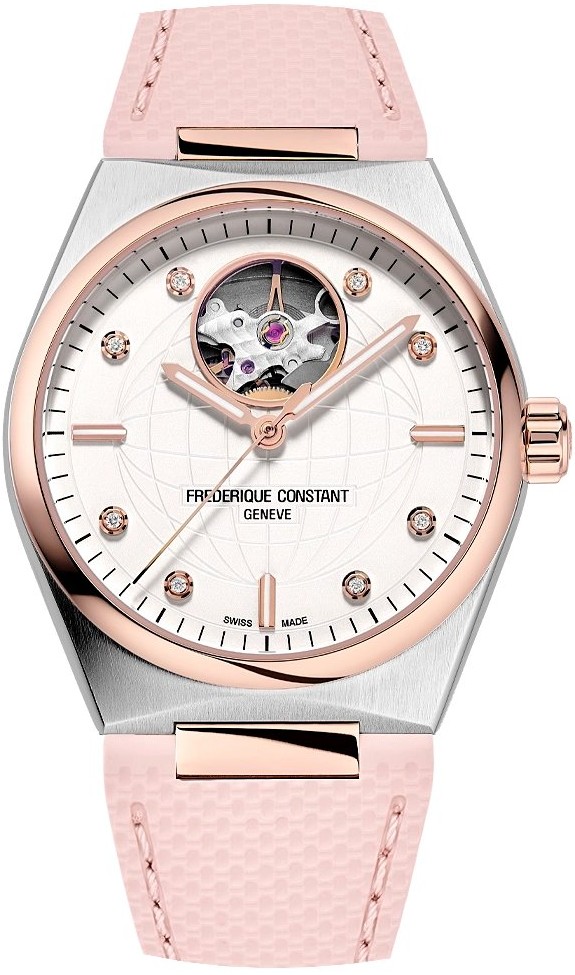 Frederique Constant Highlife Ladies Automatic Heart Beat FC-310VD2NH2B jsou dámské automatické hodinky na integrovaném ocelovém bicolor náramku s částečnou PVD úpravou v barvě růžového zlata a motýlkovou sponou. Pouzdro z nerezové oceli má průměr 34 milimetrů, průhledné dýnko a vnější lunetu s korunkou s PVD úpravou v barvě růžového zlata. Tyto univerzální hodinky v klasickém designu využijete pro každodenní nošení. Bílý číselník s motivem zeměkoule zdobený 8 diamanty o hmotnosti 0,04 ct je chráněn odolným safírovým sklem a upoutá pozornost průhledem na samotné srdce strojku (setrvačku). Aplikované hodinové indexy jsou společně s ručkami pokryty luminiscenčním nátěrem Super-LumiNova®, který garantuje perfektní čitelnost za zhoršených světelných podmínek. Pohon hodinek zajišťuje mechanický strojek FC-310 s automatickým nátahem a rezervou chodu přibližně 38 hodin. Základem kalibru je Sellita SW200. Tento strojek s funkcí hackingu lze v případě potřeby natahovat i ručně pomocí korunky. Vodotěsnost hodinek činí 5 ATM a jsou tedy odolné proti dešti a při sprchování. Součástí balení je náhradní pryžový řemínek.