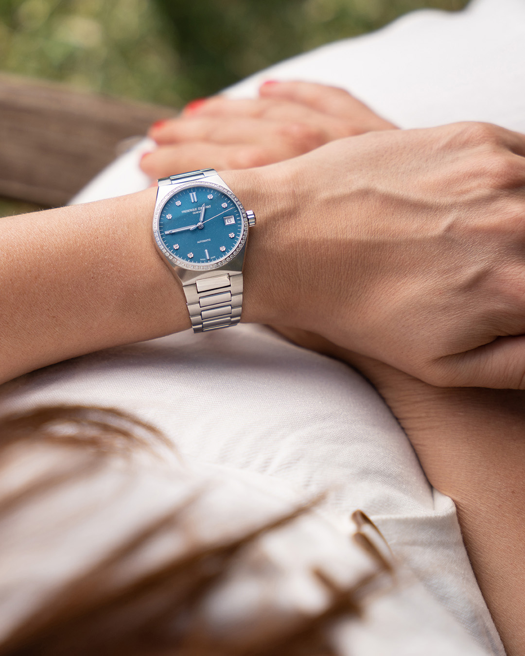 Frederique Constant Highlife Ladies Automatic Sparkling Limited Edition FC-303LBSD2NHD6B sú dámske automatické hodinky na integrovanom oceľovom náramku v kombinácii brúsu a lesku s motýlikovou sponou. Ide o limitovanú edíciu v počte 888 kusov pre celý svet. Puzdro z nerezovej ocele má priemer 34 milimetrov, signovanú korunku, priehľadné viečko a lunetu osadenú 60 diamantmi s hmotnosťou 0,45 ct. Tieto univerzálne hodinky v klasickom dizajne využijete na každodenné nosenie, aj do spoločnosti. Modrý trblietavý číselník zdobený 8 diamantmi s hmotnosťou 0,04 ct je chránený odolným zafírovým sklom. Aplikované hodinové indexy sú spoločne s ručičkami pokryté luminiscenčným náterom Super-LumiNova®, ktorý garantuje perfektnú čitateľnosť za zhoršených svetelných podmienok. Pohon hodiniek zaisťuje mechanický strojček FC-303 s automatickým náťahom a rezervou chodu približne 38 hodín. Základom kalibru je Sellita SW200. Tento strojček s funkciou hackingu je možné v prípade potreby naťahovať aj ručne pomocou korunky. Hodinky disponujú funkciou ukazovateľa dátumu a s vodotesnosťou 5 ATM sú odolné proti dažďu a pri sprchovaní. Súčasťou balenia je náhradný gumený remienok bielej farby.