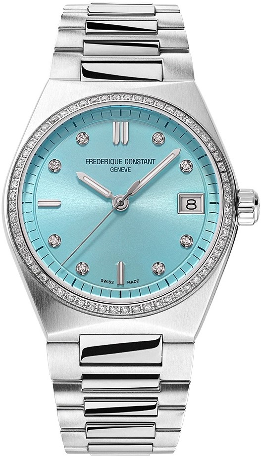 Frederique Constant Highlife Ladies Quartz FC-240LBD2NHD6B sú dámske batériové hodinky na integrovanom oceľovom náramku v kombinácii brusu a lesku s motýlikovou sponou. Puzdro z nerezovej ocele má priemer 31 milimetrov, signovanú korunku a lunetu osadenú 60 diamanty. Svetlomodrý číselník s efektom slnečného brusu zdobený 8 diamantmi s hmotnosťou 0,04 ct je chránený odolným zafírovým sklom. Aplikované hodinové indexy sú spoločne s ručičkami pokryté luminiscenčným náterom Super-LumiNova®, ktorý garantuje perfektnú čitateľnosť za zhoršených svetelných podmienok. Pohon hodiniek zaisťuje spoľahlivý quartzový strojček FC-240 (základom je strojček Ronda 515). Hodinky disponujú funkciou ukazovateľa dátumu a s vodotesnosťou 5 ATM sú odolné proti dažďu a pri sprchovaní. Súčasťou balenia je náhradný gumený remienok bielej farby.