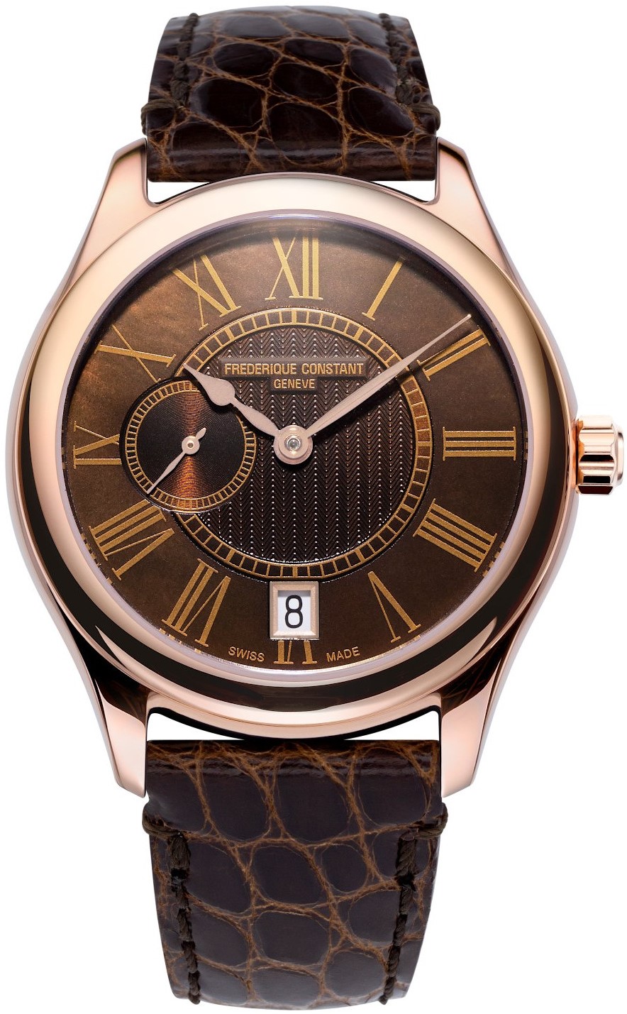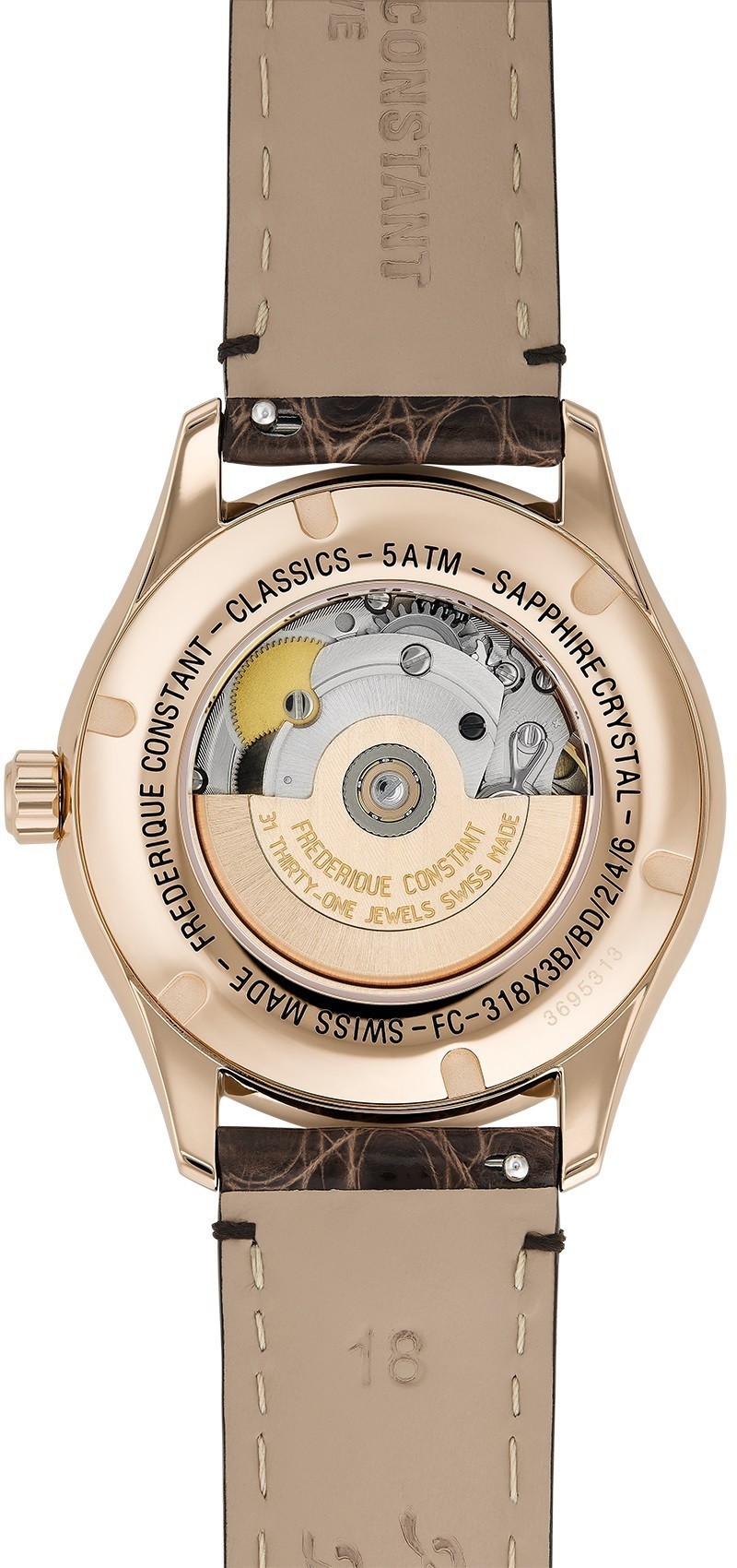 Frederique Constant Ladies Automatic Small Seconds FC-318MPC3B4 jsou dámské automatické hodinky na hnědém koženém řemínku s překlápěcí sponou. Pouzdro z nerezové oceli s PVD úpravou v barvě růžového zlata má průměr 36 milimetrů, průhledné dýnko a signovanou korunku. Tyto univerzální elegantní hodinky jsou vhodnou volbou pro každodenní nošení. Hnědý číselník s indikací data a středem zdobeným giloší je chráněn odolným safírovým sklem. Zlaté hodinové indexy ve tvaru římských číslic vynikají na hnědém perleťovém obvodu číselníku a jsou doplněny elegantními pikovými ručičkami a sekundovou ručkou v subciferníku na deváté hodině. Pohon hodinek zajišťuje mechanický strojek FC-318 s automatickým nátahem a rezervou chodu přibližně 38 hodin. Základem tohoto kalibru je Sellita SW290. Tento strojek s funkcí hackingu lze v případě potřeby natahovat i ručně pomocí korunky. S vodotěsností 5 ATM jsou hodinky odolné proti dešti a při sprchování.