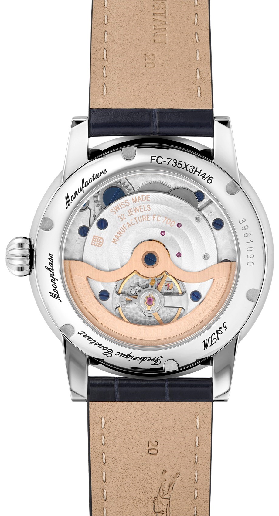 Frederique Constant Manufacture Classic Power Reserve Big Date FC-735S3H6 sú pánske automatické hodinky na modrom remienku z aligátora kože s preklápacou sponou. Puzdro z nerezovej ocele má priemer 40 milimetrov, priehľadné viečko a zdobenú korunku. Tieto elegantné hodinky sú vhodnou voľbou na každodenné nosenie. Strieborný číselník s efektom slnečného brusu, indikáciou dátumu v prevedení big date, ukazovateľom rezervy náťahu a indikáciou mesačnej fázy je chránený odolným zafírovým sklom. Pohon hodiniek zaisťuje manufaktúrny strojček FC-735 s automatickým náťahom a rezervou chodu približne 50 hodín. Tento strojček s funkciou hackingu je možné v prípade potreby naťahovať aj ručne pomocou korunky. Vodotesnosť hodiniek je 5 ATM a sú teda odolné proti dažďu a pri sprchovaní.