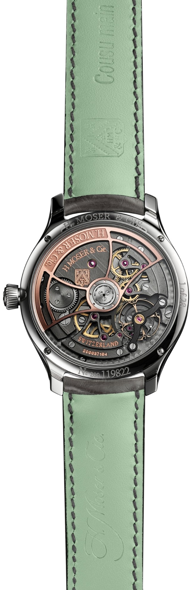 H. Moser & Cie Endeavour Small Seconds Concept Pop Limited Edition 1202-1203 sú luxusné automatické unisex hodinky na šedom koženom remienku z pštrosej kože. Puzdro z nerezovej ocele má priemer 38 milimetrov a priehľadné viečko. Ružový číselník v minimalistickom dizajne so zelenou mimostrednou sekundovou ručičkou je tvorený z ružového opálu a barmského nefritu a chráni ho odolné zafírové sklo. Ružový opál pochádza z Peru a vyznačuje sa svojimi obláčikovými vzormi a prirodzenými prasklinami. Na vytvorenie takého číselníka boli vybrané iba tie najkvalitnejšie kusy zaisťujúce hladký a jednotný vzhľad. Barmský nefrit (známy aj ako cisársky nefrit) je jedným z najuznávanejších kameňov v Ázii, ceneným pre svoju priesvitnosť a žiarivý zelený odtieň. Prítomnosť zelených žiliek, obláčikov alebo škvŕn značí jeho vysokú hodnotu, vďaka čomu je medzi zelenými drahokamami jedinečný. Kombináciou ružového opálu a barmského nefritu sa hodinky stávajú plátnom prirodzenej elegancie. Pohon hodiniek zaisťuje mechanický stroj HMC 202 s automatickým náťahom a rezervou chodu 72 hodín. S vodotesnosťou  3 ATM sú hodinky odolné proti dažďu a pri umývaní rúk. Ide o limitovanú edíciu v počte 28 kusov pre celý svet.