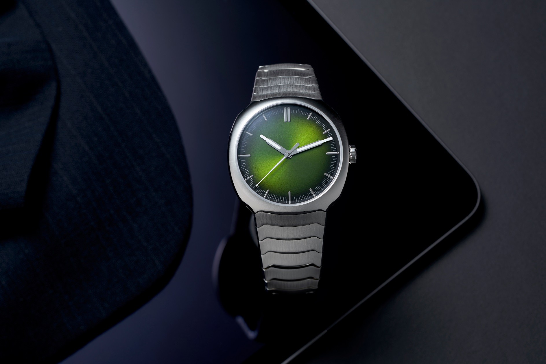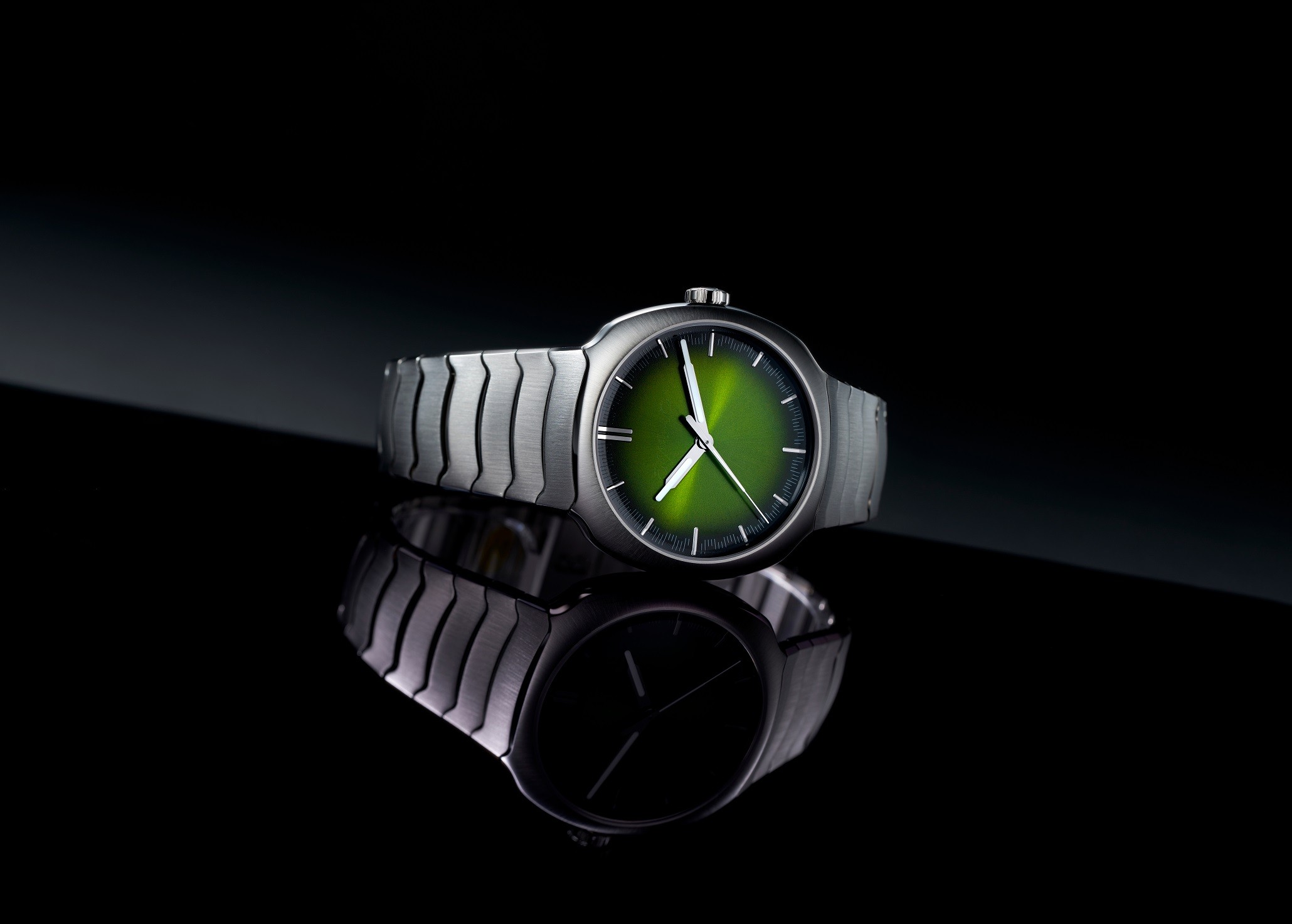 H. Moser & Cie Streamliner Centre Seconds Matrix Green 6201-1200 sú pánske automatické luxusné hodinky na jednoradovom oceľovom integrovanom náramku s brúsenou povrchovou úpravou a motýlikovou sponou. Puzdro z nerezovej ocele má priemer 40 milimetrov a priehľadné viečko ponúkajúce pohľad na strojček s pozláteným rotorom. Zelený gradientný číselník s efektom slnečného brusu a centrálnou sekundovou ručičkou je chránený odolným zafírovým sklom. Ručičky disponujú luminiscenčným náterom Globolight® obsahujúcim Super-LumiNova®, ktorý garantuje perfektnú čitateľnosť za zhoršených svetelných podmienok. Pohon hodiniek zaisťuje mechanický manufaktúrny stroj HMC 201 s automatickým náťahom a rezervou chodu 72 hodín. S vodotesnosťou 12 ATM sú hodinky vhodné pre plávanie a šnorchlovanie.