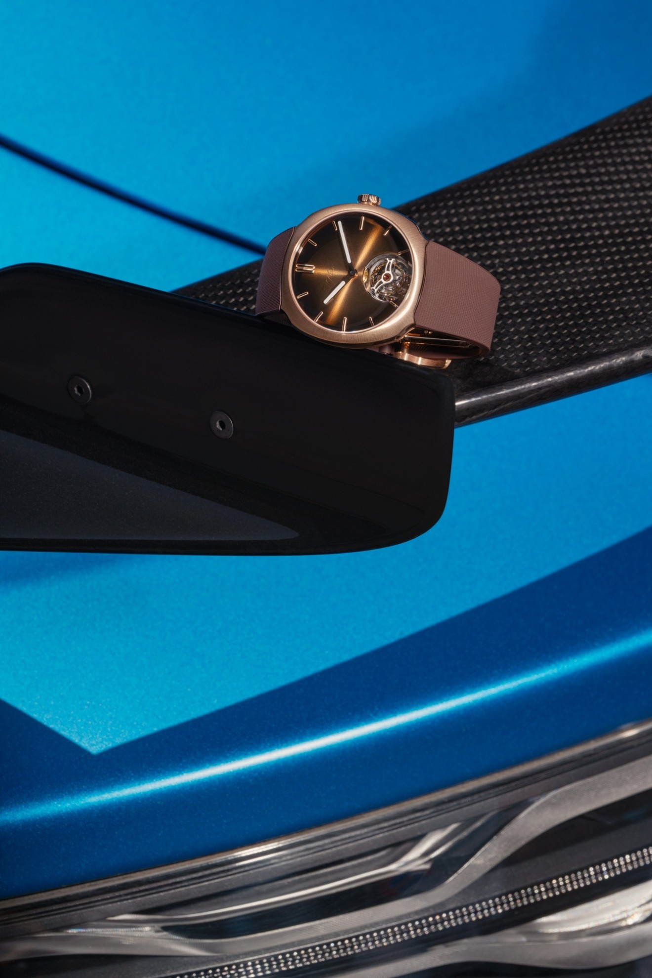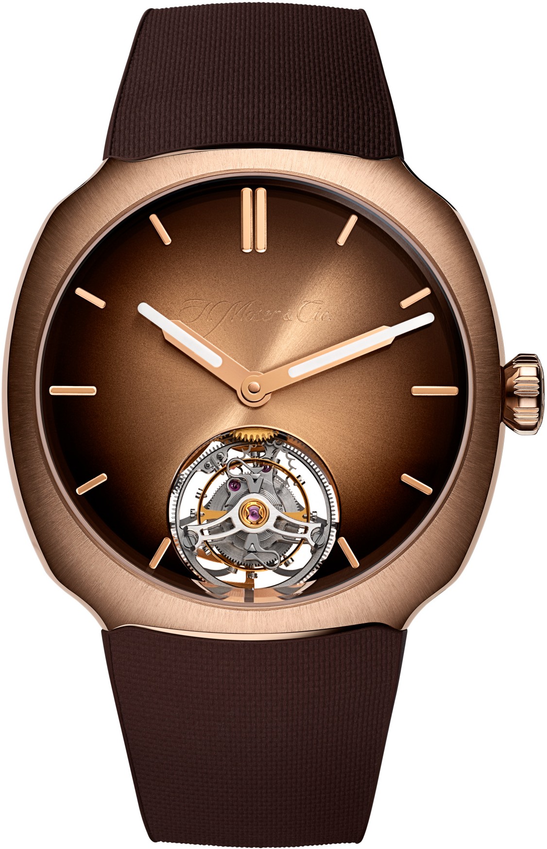 H. Moser & Cie Streamliner Tourbillon Pierre Gasly Limited Edition 6805-0410 sú pánske automatické luxusné hodinky na hnedom kaučukovom remienku s motýlikovou sponou. Puzdro z červeného zlata má priemer 40 milimetrov, skrutkovaciu korunku a priehľadné viečko ponúkajúce pohľad na strojček. Čokoládovo-hnedý gradientný číselník s efektom slnečného brusu a priehľadom na zotrvačku v prevedení kráľovskej komplikácie „Tourbillon“ je chránený odolným zafírovým sklom. Ručičky disponujú luminiscenčným náterom Globolight® obsahujúcim Super-LumiNova®, ktorý garantuje perfektnú čitateľnosť za zhoršených svetelných podmienok. Pohon hodiniek zaisťuje mechanický strojček HMC 805 s automatickým náťahom a rezervou chodu 72 hodín. Kaliber je vybavený dvojicou vláskov, ktorých ťažisko je korigované samostatne, čím sa výrazne zvyšuje presnosť a zároveň minimalizuje trenie oproti strojčekom s jedným vláskom. Medzi ďalšiu individualitu patrí aj výmena Tourbillonu ako samostatného modulu a kombinuje sa tak elegancia, štýl a praktickosť. S vodotesnosťou 12 ATM sú hodinky vhodné na plávanie a šnorchlovanie. Táto limitovaná edícia, obmedzená na iba 100 kusov pre celý svet, bola vytvorená v úzkej spolupráci s Pierrom Gaslym, nekonvenčným jazdcom F1. V úzkej spolupráci s hodinármi H. Moser & Cie utváral každý detail hodiniek.