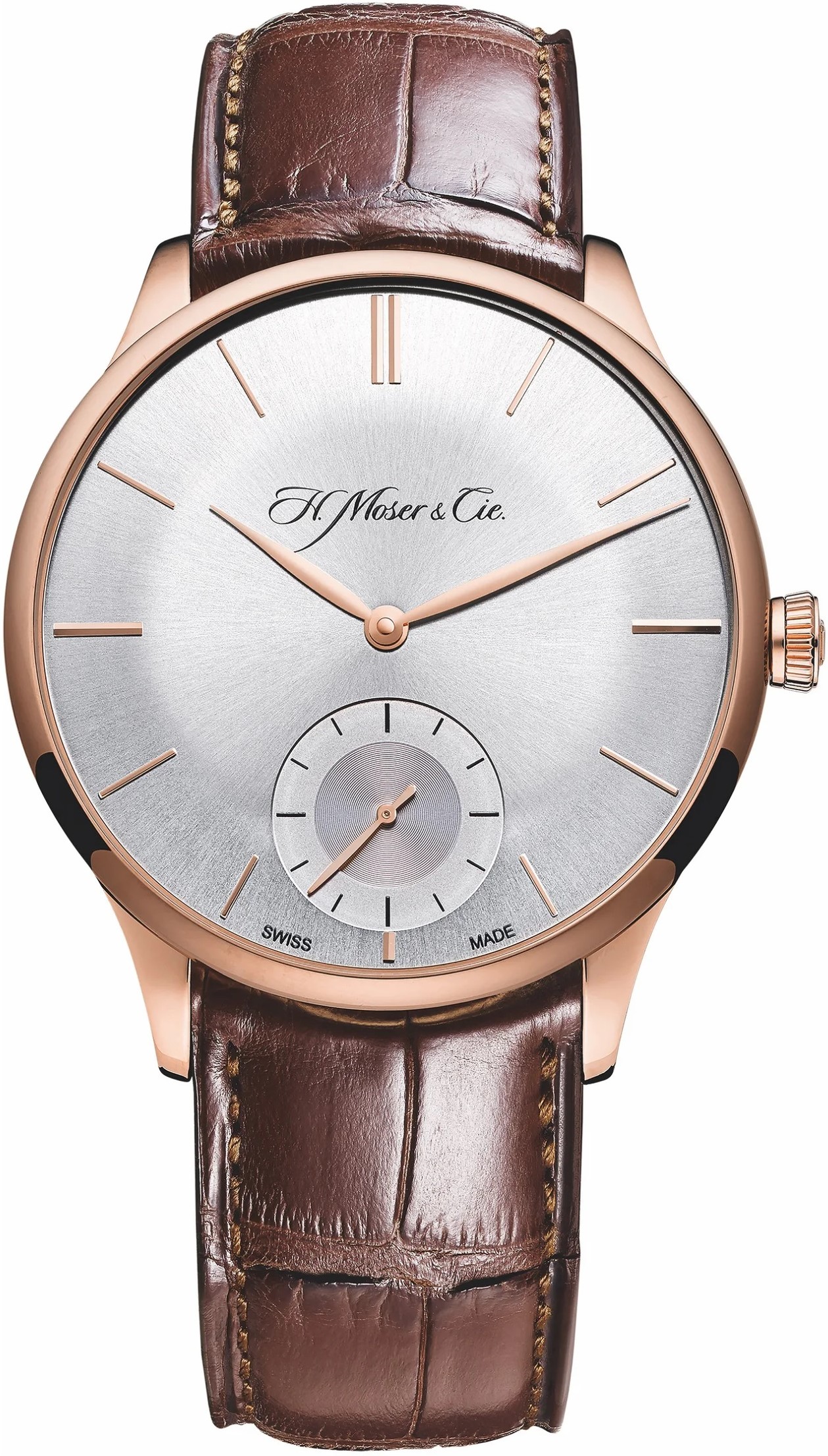 H. Moser & Cie Venturer Small Seconds 2327-0400 sú pánske mechanické luxusné hodinky na hnedom remienku z kože aligátora s tŕňovou sponou. Puzdro z 18 karátového ružového zlata má priemer 39 milimetrov a priehľadné viečko, ktoré ponúka pohľad na strojček vrátane ukazovateľa rezervy náťahu. Strieborný číselník s efektom slnečného brusu a mimostrednou sekundovou ručičkou je chránený odolným zafírovým sklom. Pohon hodiniek zaisťuje mechanický stroj HMC 327 s ručným náťahom a rezervou chodu 72 hodín. S vodotesnosťou 3 ATM sú hodinky odolné proti dažďu a pri umývaní rúk.