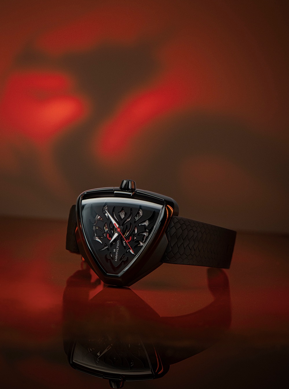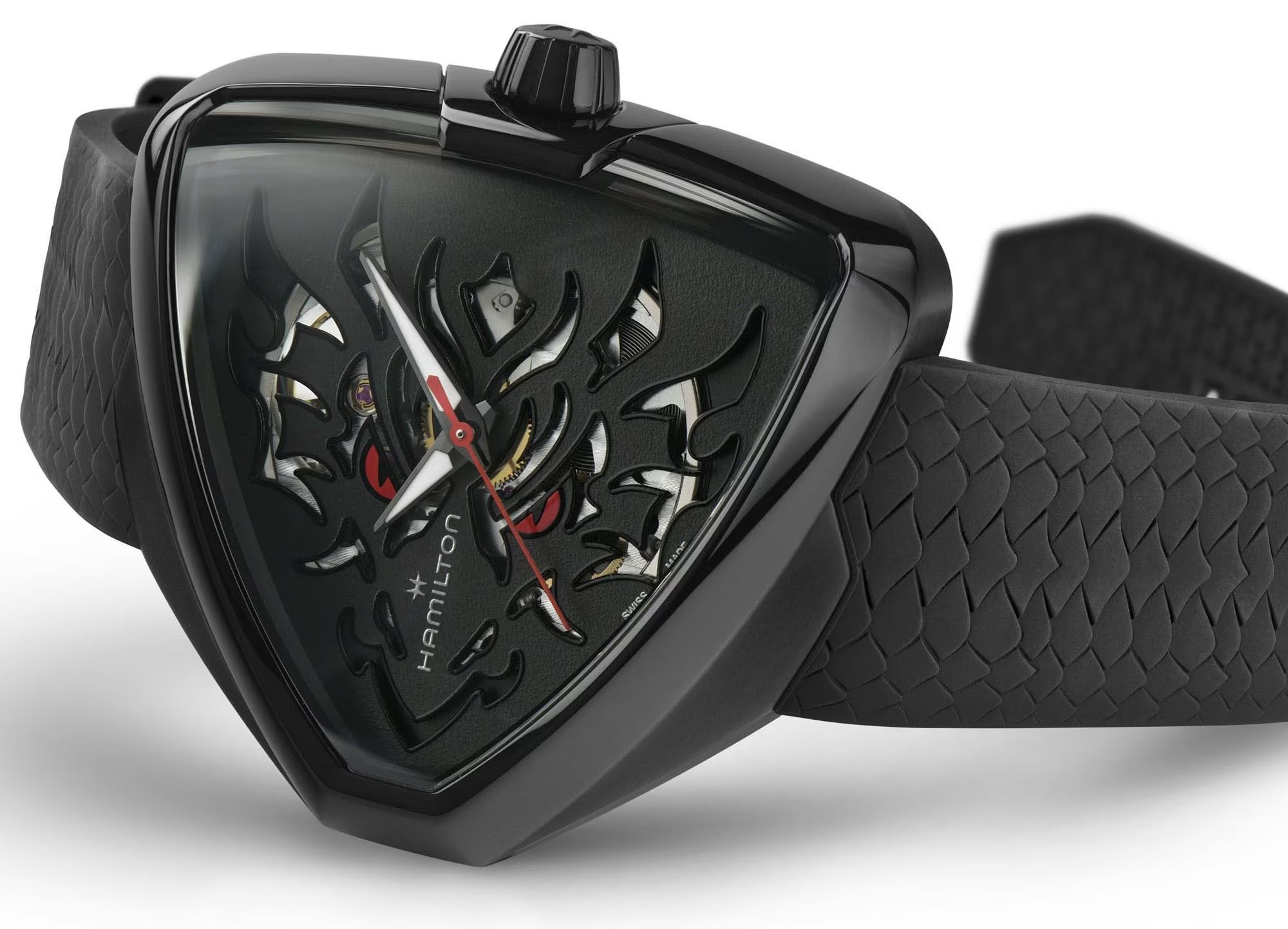 Hamilton Ventura Elvis80 Skeleton Auto H24535332 sú pánske športové automatické hodinky na čiernom kaučukovom remienku so vzorom dračej kože a tŕňovou sponou. Ikonické puzdro v tvare trojuholníka z nerezovej ocele s povrchovou PVD úpravou čiernej farby má veľkosť 42 x 45 milimetrov a priehľadné viečko. Čierny skeletónový číselník s otvormi v číselníku tvoriaci hlavu draka je chránený odolným zafírovým sklom s antireflexnou vrstvou. Čierny skeletónový číselník s otvormi v číselníku tvoriaci hlavu draka je chránený odolným zafírovým sklom s antireflexnou vrstvou. Ručičky disponujú luminiscenčným náterom Super-LumiNova®, ktorý garantuje perfektnú čitateľnosť za zhoršených svetelných podmienok. Pohon hodiniek zaisťuje mechanický  strojček H-10-S s automatickým náťahom a rezervou chodu 80 hodín. S vodotesnosťou 5 ATM sú hodinky odolné proti dažďu a pri sprchovaní. Hodinky boli vytvorené na počesť ultimátneho porušovateľa pravidiel a najväčšieho fanúšika kolekcie Ventura, Elvisa Presleyho.