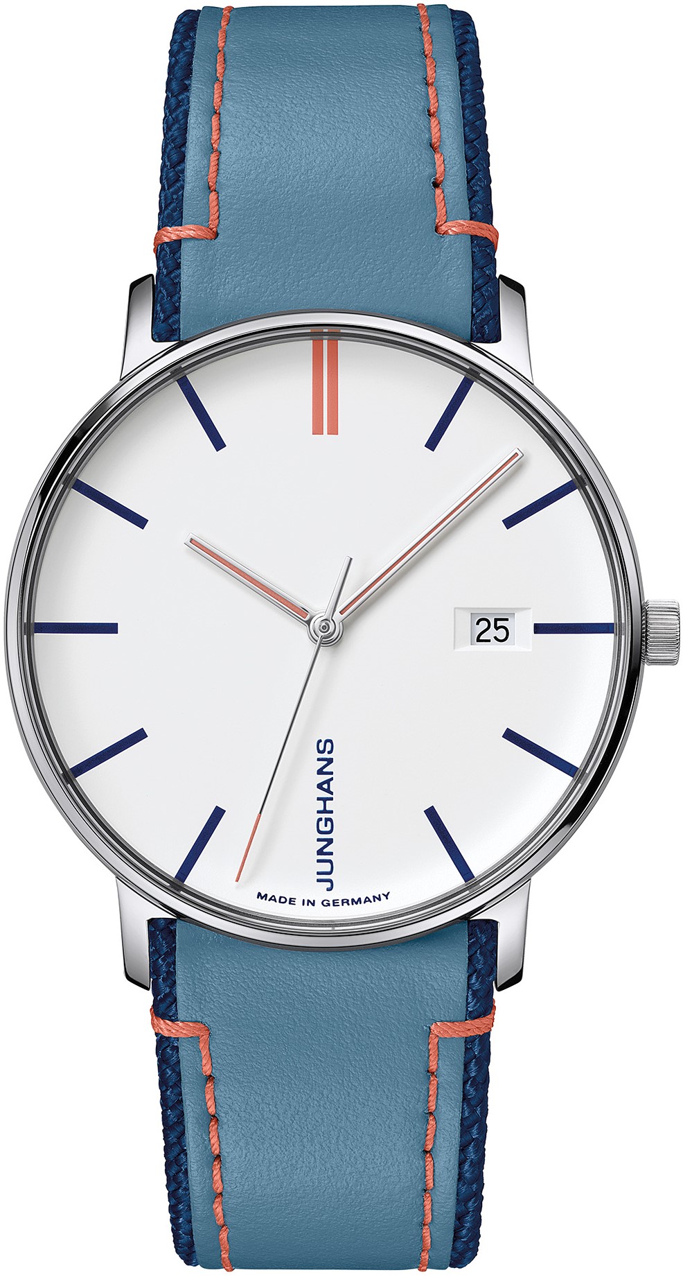 Junghans FORM Quartz 41/4481.00 sú pánske batériové hodinky na modrom textilnom remienku s oranžovým prešívaním a tŕňovou sponou. Puzdro z nerezovej ocele má priemer 39,9 milimetra. Biely číselník s ukazovateľom dátumu na tretej hodine je chránený zafírovým sklom s antireflexnou vrstvou. Ručičky a indexy sú pokryté luminiscenčným náterom Super-LumiNova®, ktorý po nasvietení garantuje perfektnú čitateľnosť za zhoršených svetelných podmienok. Pohon hodiniek zaisťuje quartzový strojček J645.37. S vodotesnosťou 5 ATM sú hodinky odolné proti dažďu a pri sprchovaní.