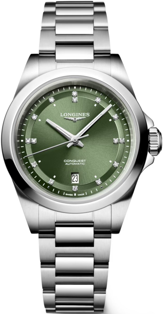 Longines Conquest L3.320.4.07.6 jsou dámské hodinky v klasickém stylu na ocelovém náramku s motýlkovou sponou. Pouzdro z nerezové oceli má průměr 30 milimetrů, broušenou povrchovou úpravu a průhledné dýnko. Zelený číselník s efektem slunečního brusu, ukazatelem data a 15 diamanty Top Wesselton o čistotě VS-SI a hmotnosti 0,037 ct je chráněn safírovým sklem s oboustrannou antireflexní vrstvou. Ručičky společně s body po obvodu číselníku jsou pokryty luminiscenčním nátěrem Super-LumiNova®, který po nasvícení garantuje perfektní čitelnost za zhoršených světelných podmínek. Pohon hodinek zajišťuje mechanický strojek L592 s automatickým nátahem a rezervou chodu přibližně 45 hodin. Kalibr je vybaven křemíkovým vláskem setrvačky, který hodinkám propůjčuje vysokou rezistenci vůči magnetickým polím. S vodotěsností 10 ATM jsou hodinky v hodné pro plavání a šnorchlování.