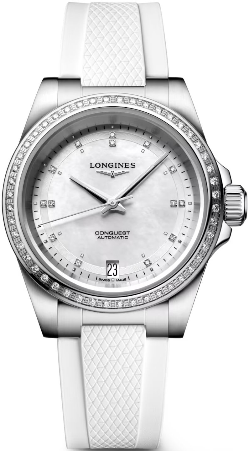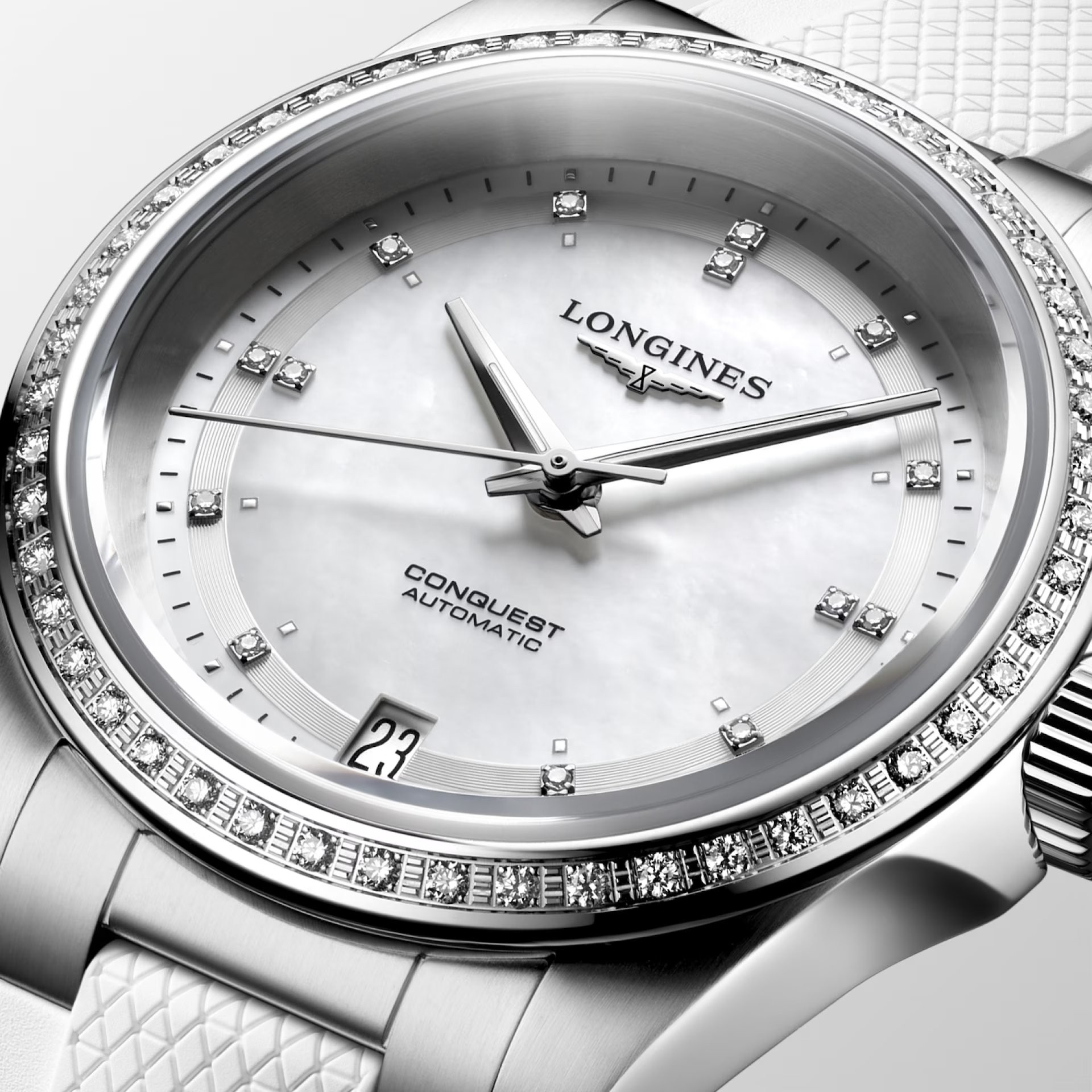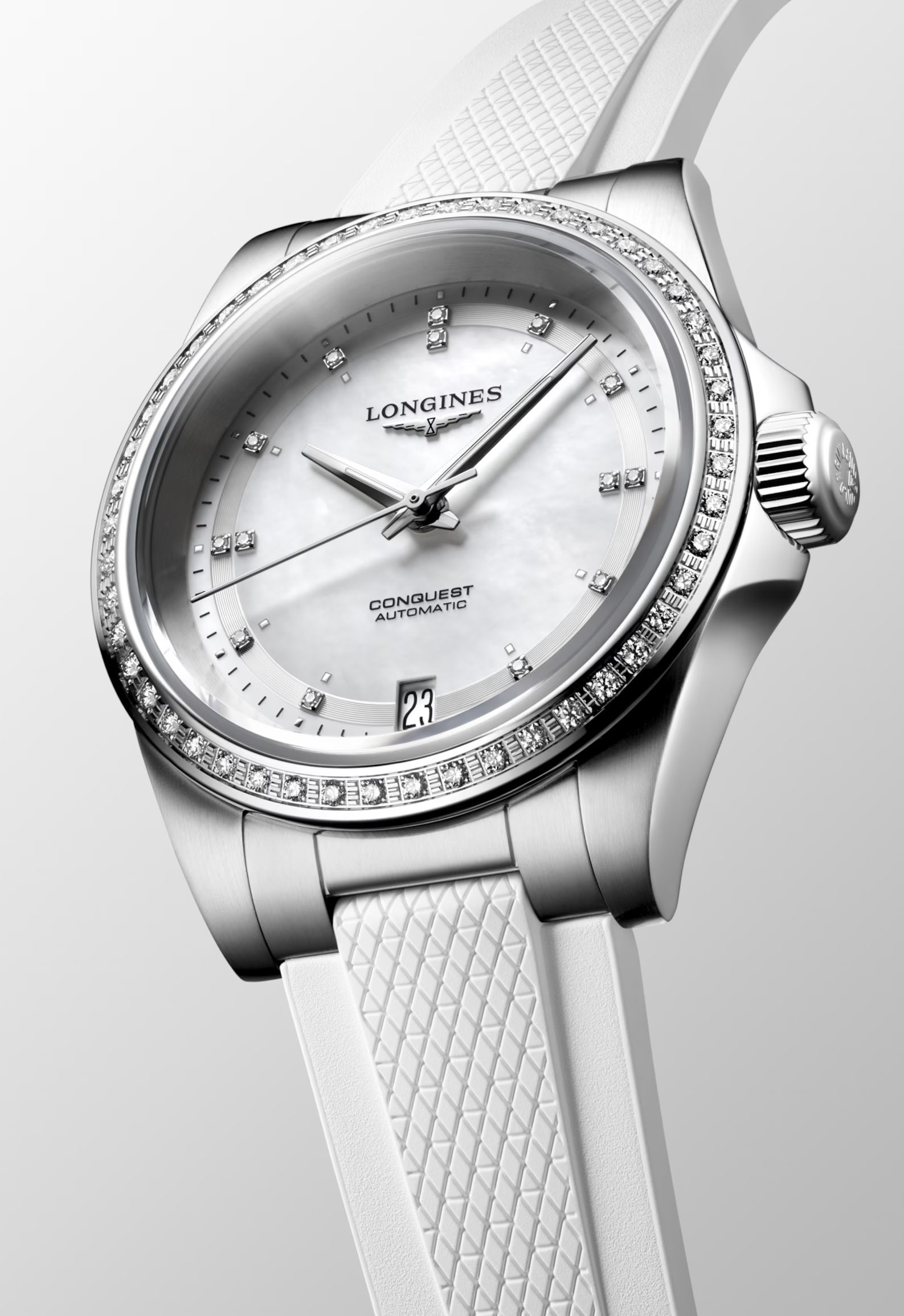 Longines Conquest L3.430.0.87.9 jsou dámské luxusní hodinky na bílém kaučukovém řemínku s překlápěcí sponou. Pouzdro z nerezové oceli má průměr 34 milimetrů, průhledné dýnko, šroubovací korunku a lunetu osazenou 48 diamanty Top Wesselton o čistotě IF-VVS a hmotnosti 0,403 ct. Perleťový číselník s ukazatelem data a 14 diamanty Top Wesselton o čistotě VS-SI a hmotnosti 0,035 ct je chráněn safírovým sklem s oboustrannou antireflexní vrstvou a jeho krása vyniká zejména pod přímým světlem, kdy můžeme pozorovat hru barev perleti. Ručičky společně s body po obvodu číselníku jsou pokryty luminiscenčním nátěrem Super-LumiNova®, který po nasvícení garantuje perfektní čitelnost za zhoršených světelných podmínek. Pohon hodinek zajišťuje mechanický strojek L888 s automatickým nátahem a rezervou chodu přibližně 72 hodin. Tento strojek s funkcí zastavení vteřinové ručky při vytažení korunky do krajní polohy, pro kterou se vžilo označení hacking, je možné v případě potřeby natahovat i ručně. Kalibr je vybaven křemíkovým vláskem setrvačky, který hodinkám propůjčuje vysokou rezistenci vůči magnetickým polím. S vodotěsností 10 ATM jsou hodinky v hodné pro plavání a šnorchlování.