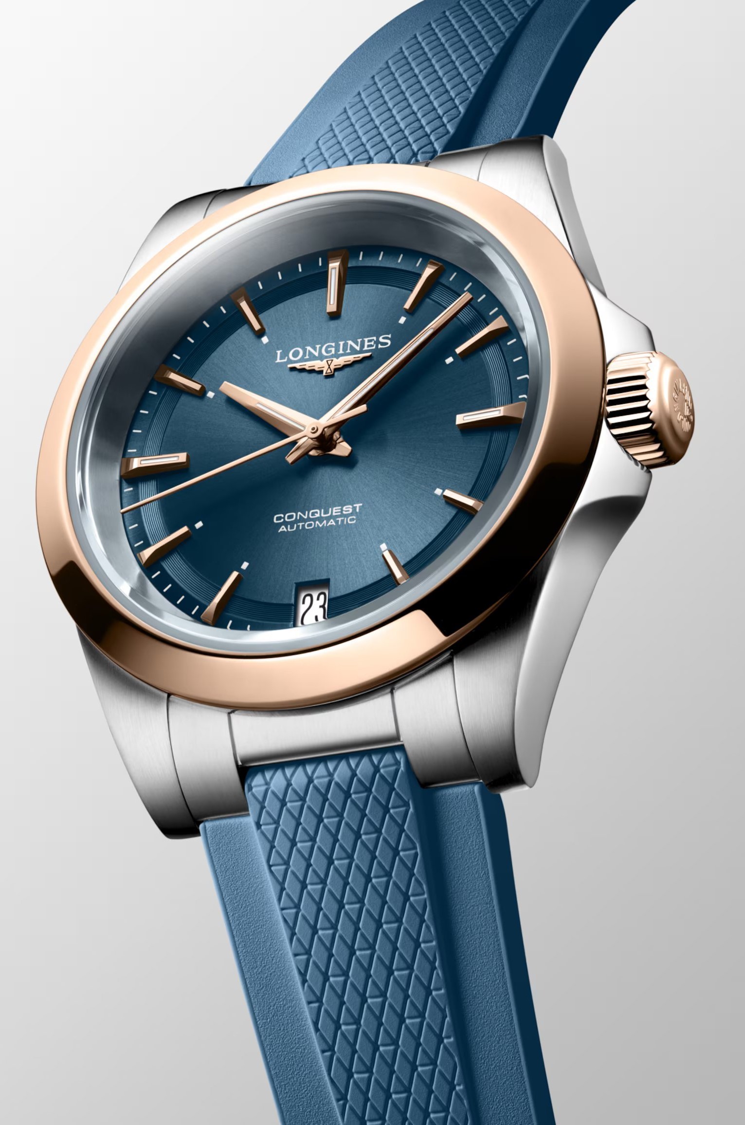 Longines Conquest L3.430.5.92.9 jsou dámské automatické hodinky na modrém kaučukovém řemínku s překlápěcí sponou. Pouzdro z nerezové oceli má průměr 34 milimetrů, průhledné dýnko a lunetu i šroubovací korunku zlacenou 18k růžovým zlatem. Modrý číselník s efektem slunečního brusu a ukazatelem data na šesté hodině je chráněn safírovým sklem s oboustrannou antireflexní vrstvou. Ručičky a indexy jsou pokryty luminiscenčním nátěrem Super-LumiNova®, který po nasvícení garantuje perfektní čitelnost za zhoršených světelných podmínek. Pohon hodinek zajišťuje mechanický strojek L888 s automatickým nátahem a rezervou chodu přibližně 72 hodin. Tento strojek s funkcí zastavení vteřinové ručky při vytažení korunky do krajní polohy, pro kterou se vžilo označení hacking, je možné v případě potřeby natahovat i ručně. Kalibr je vybaven křemíkovým vláskem setrvačky, který hodinkám propůjčuje vysokou rezistenci vůči magnetickým polím. S vodotěsností 10 ATM jsou hodinky v hodné pro plavání a šnorchlování.