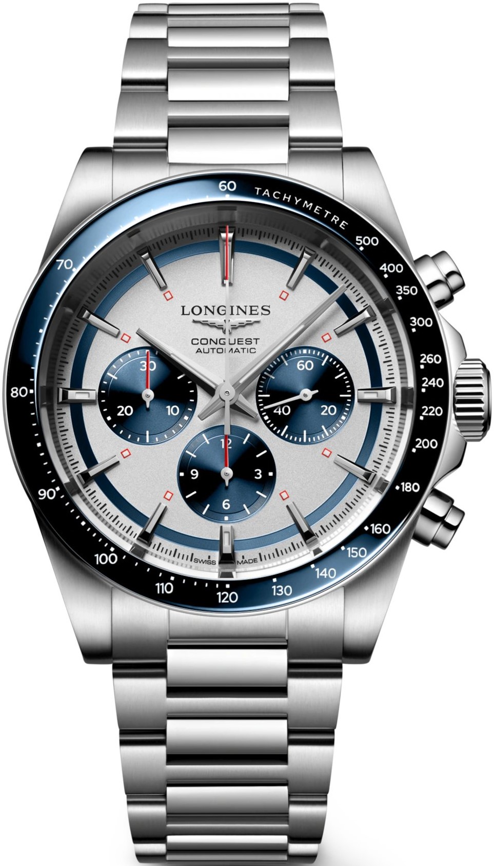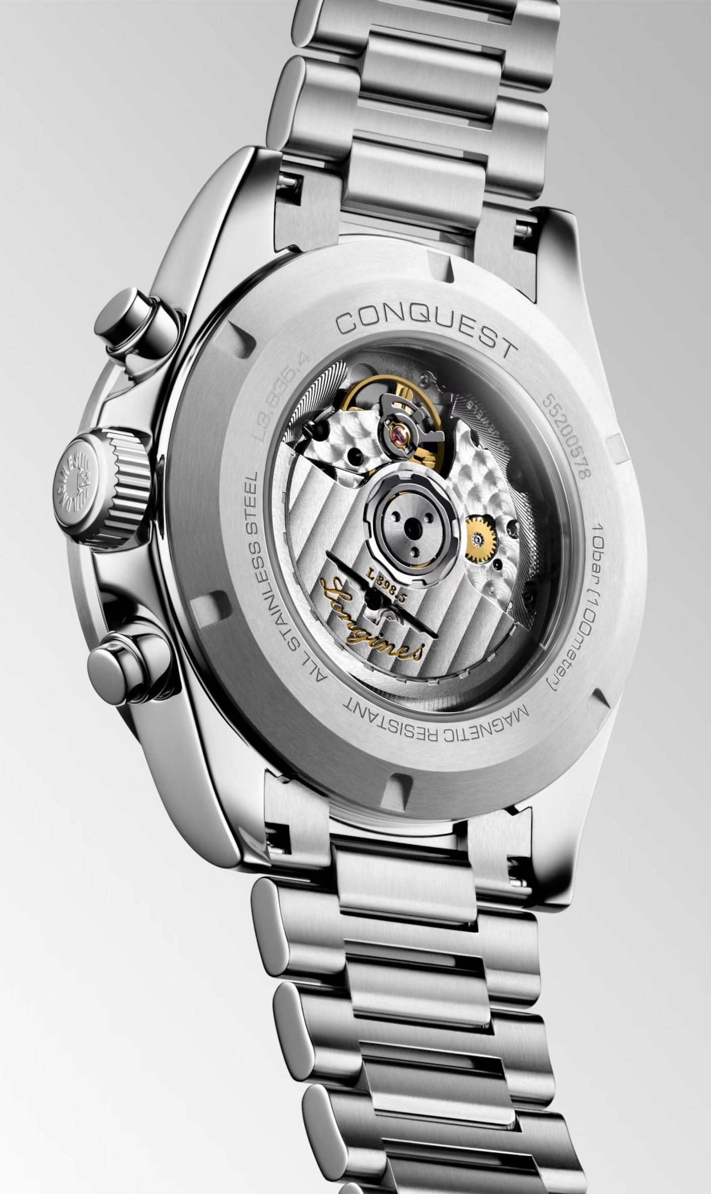 Longines Conquest L3.835.4.98.6 jsou pánské sportovní hodinky na ocelovém náramku s motýlkovou sponou. Pouzdro z nerezové oceli má průměr 42 milimetrů, průhledné dýnkošroubovací korunku a jednosměrně otočnou lunetu s modrou keramickou vložkou s tachymetrickou stupnicí. Stříbrný číselník s modrými subciferníky chronografu je chráněn safírovým sklem s oboustrannou antireflexní vrstvou. Ručičky a indexy jsou pokryty luminiscenčním nátěrem Super-LumiNova®, který po nasvícení garantuje perfektní čitelnost za zhoršených světelných podmínek. Pohon hodinek zajišťuje mechanický strojek L898 s automatickým nátahem a rezervou chodu přibližně 59 hodin. Kalibr je vybaven křemíkovým vláskem setrvačky, který hodinkám propůjčuje vysokou rezistenci vůči magnetickým polím. S vodotěsností 10 ATM jsou hodinky vhodné pro plavání a šnorchlování.