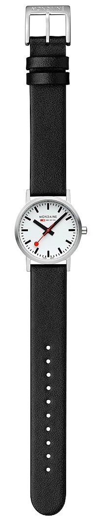 MONDAINE Classic A658.30323.16SBBV jsou dámské hodinky na černém řemínku z veganské kůže s trnovou sponou. Pouzdro z nerezové oceli má průměr 30 milimetrů. Přehledný bílý číselník je chráněn minerálním sklíčkem a je inspirován ikonickými nádražními hodinami s červenou sekundovou ručkou. Pohon hodinek zajišťuje quartzový strojek Ronda 513. S vodotěsností 3 ATM jsou hodinky odolné proti dešti a při mytí rukou.