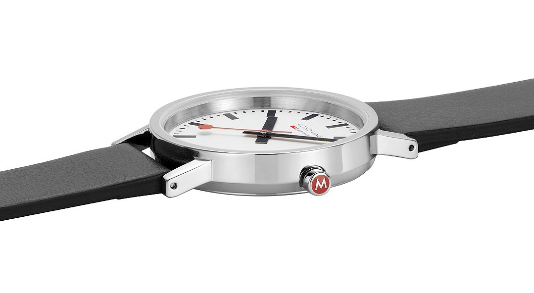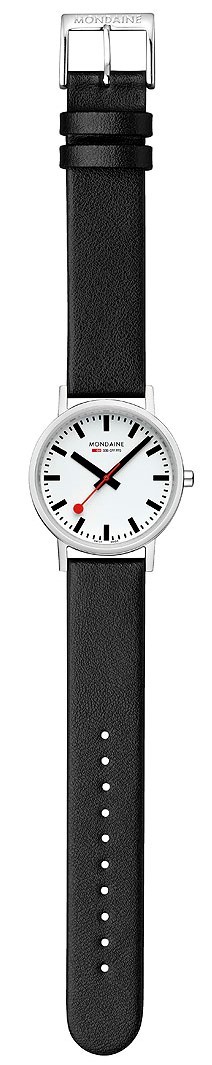 MONDAINE Classic A660.30314.11SBBV jsou dámské hodinky na černém řemínku z veganské kůže s trnovou sponou. Pouzdro z nerezové oceli má průměr 36 milimetrů. Přehledný bílý číselník je chráněn minerálním sklíčkem a je inspirován ikonickými nádražními hodinami s červenou sekundovou ručkou. Pohon hodinek zajišťuje quartzový strojek Ronda 513. S vodotěsností 3 ATM jsou hodinky odolné proti dešti a při mytí rukou.