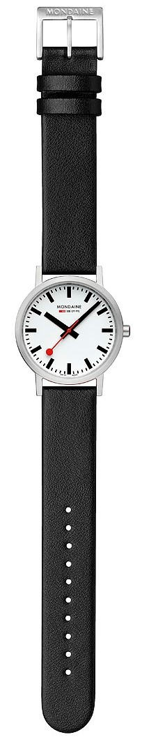 MONDAINE Classic A660.30314.16SBBV jsou dámské hodinky na černém řemínku z veganské kůže s trnovou sponou. Pouzdro z nerezové oceli má průměr 36 milimetrů. Přehledný bílý číselník je chráněn minerálním sklíčkem a je inspirován ikonickými nádražními hodinami s červenou sekundovou ručkou. Pohon hodinek zajišťuje quartzový strojek Ronda 513. S vodotěsností 3 ATM jsou hodinky odolné proti dešti a při mytí rukou.