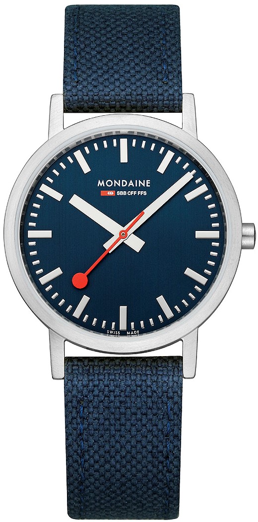 MONDAINE Classic A660.30314.40SBD jsou dámské hodinky na modrém textilním řemínku z recyklovaných PET lahví s korkovou podšívkou a trnovou sponou. Pouzdro z nerezové oceli má průměr 36 milimetrů. Přehledný modrý číselník je chráněn minerálním sklíčkem a je inspirován ikonickými nádražními hodinami s červenou sekundovou ručkou. Pohon hodinek zajišťuje quartzový strojek Ronda 513. S vodotěsností 3 ATM jsou hodinky odolné proti dešti a při mytí rukou.