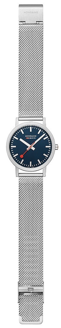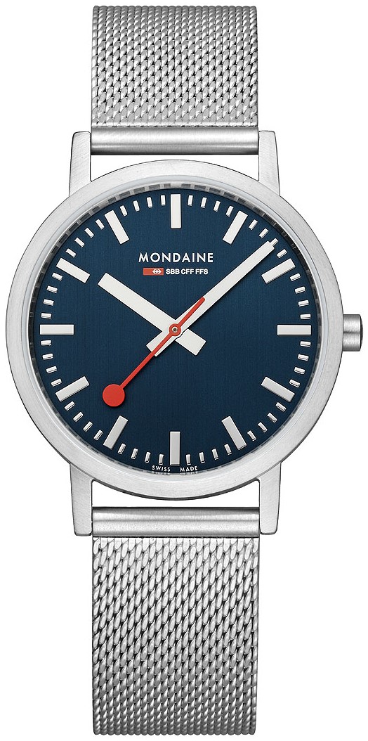 MONDAINE Classic A660.30314.40SBJ jsou dámské elegantní hodinky na ocelovém milánském tahu s posuvnou sponou. Pouzdro z nerezové oceli má průměr 36 milimetrů. Přehledný modrý číselník je chráněn minerálním sklíčkem a je inspirován ikonickými nádražními hodinami s červenou sekundovou ručkou. Pohon hodinek zajišťuje quartzový strojek Ronda 513. S vodotěsností 3 ATM jsou hodinky odolné proti dešti a při mytí rukou.